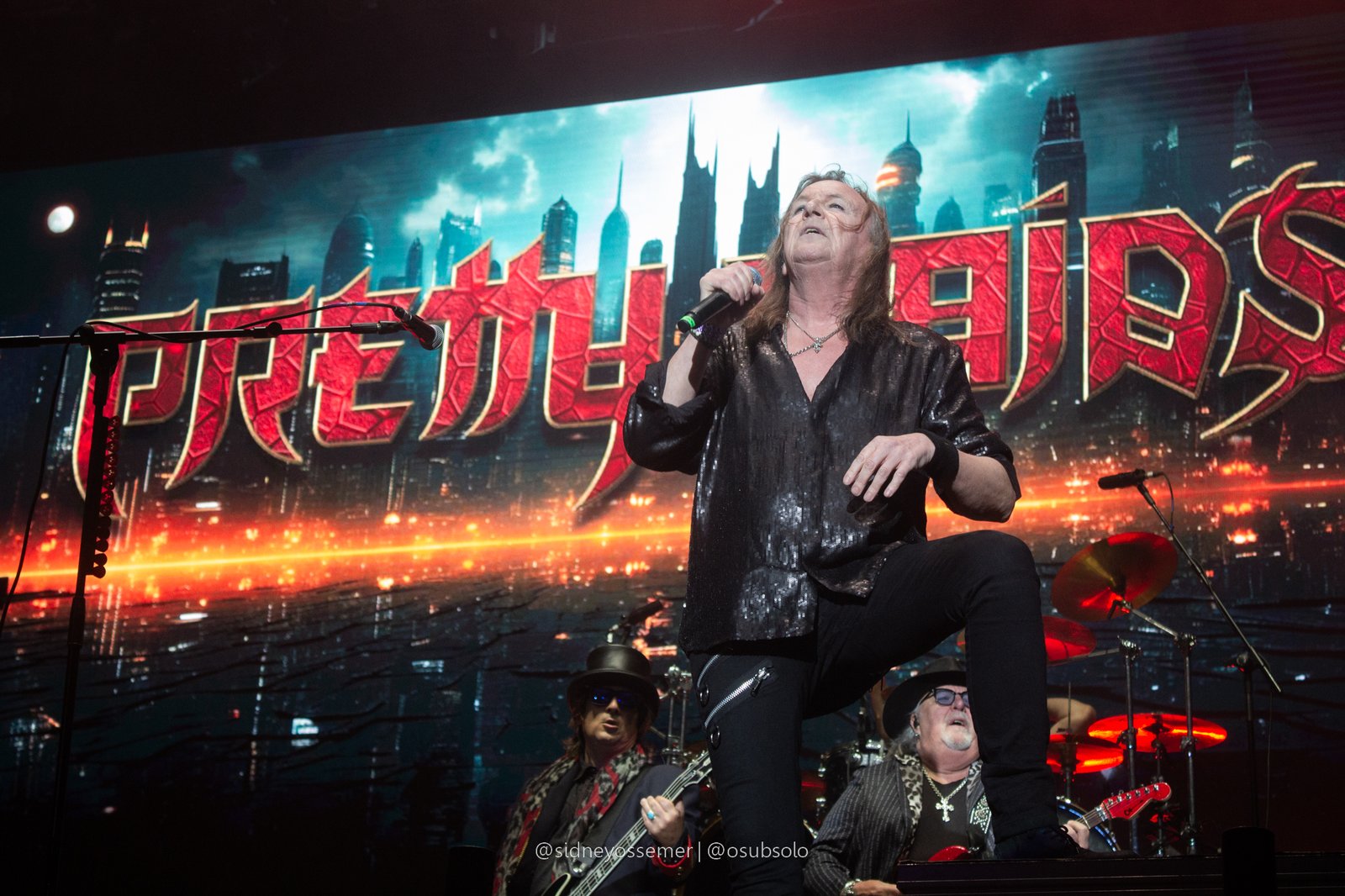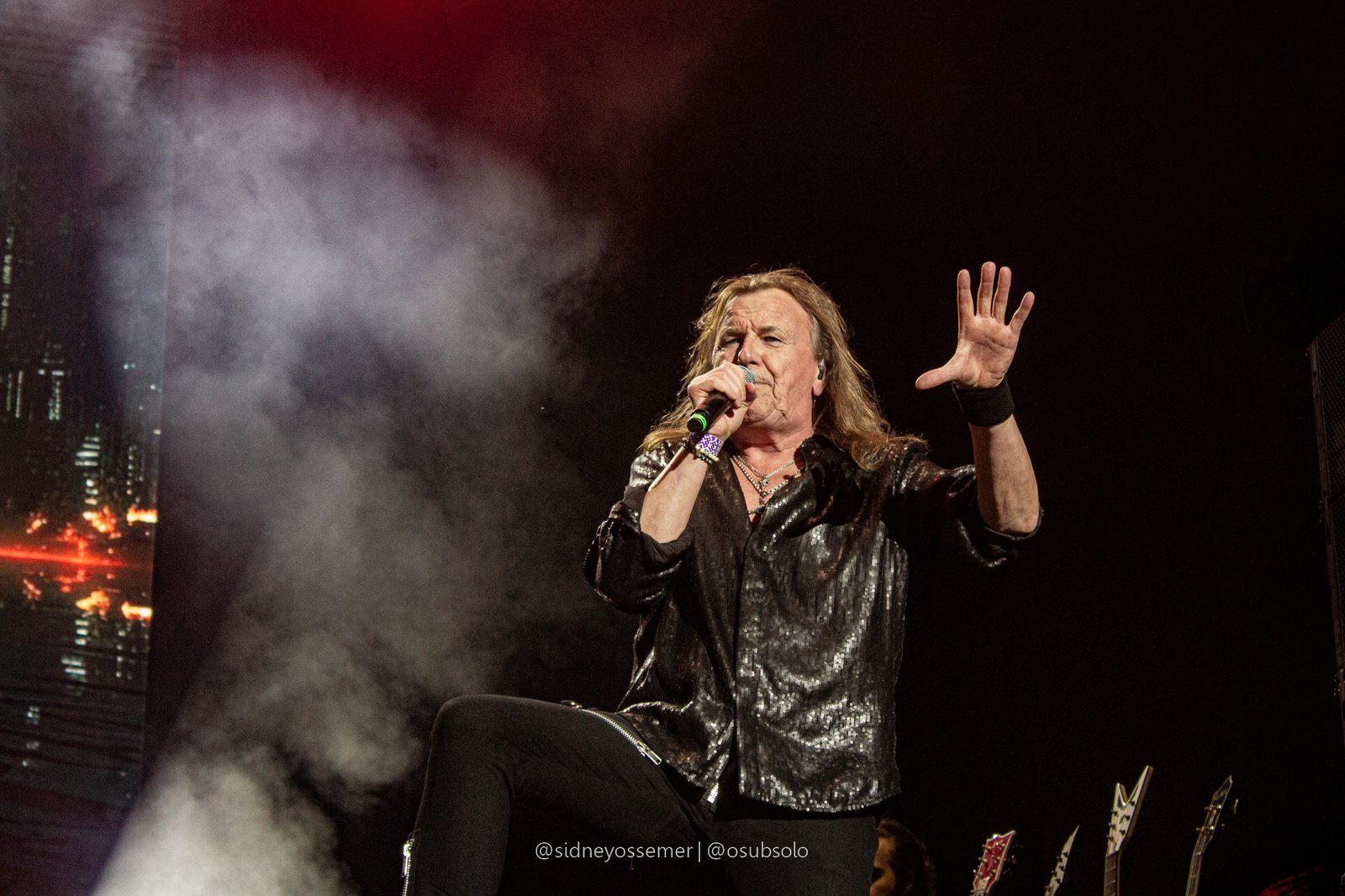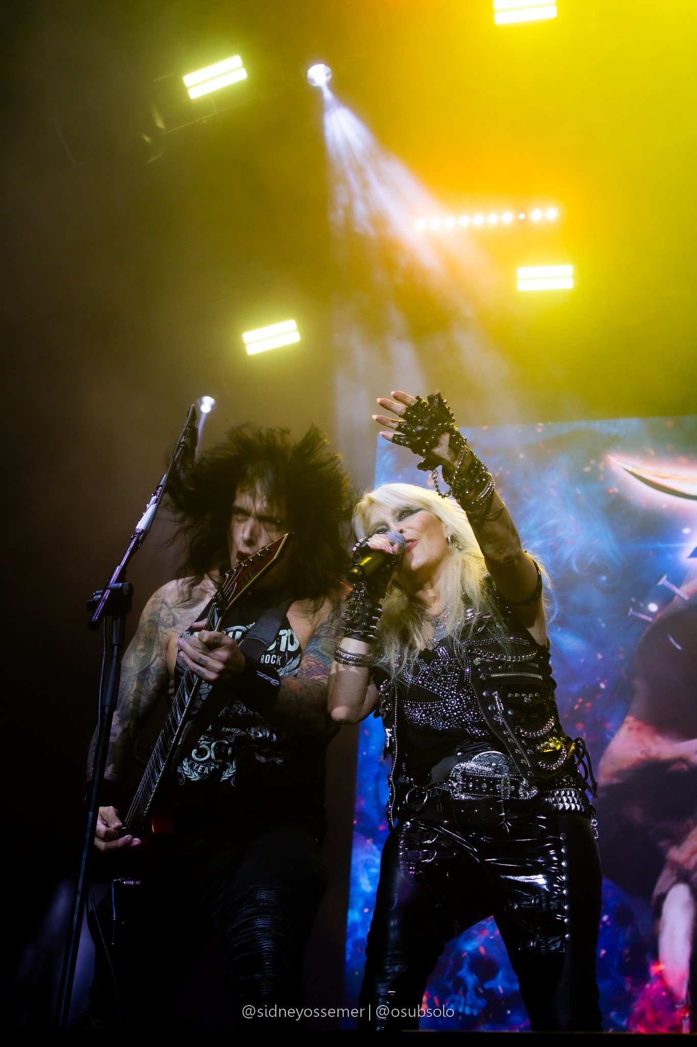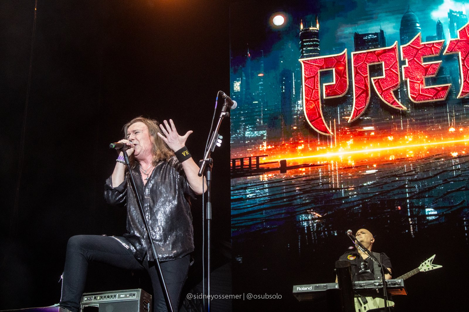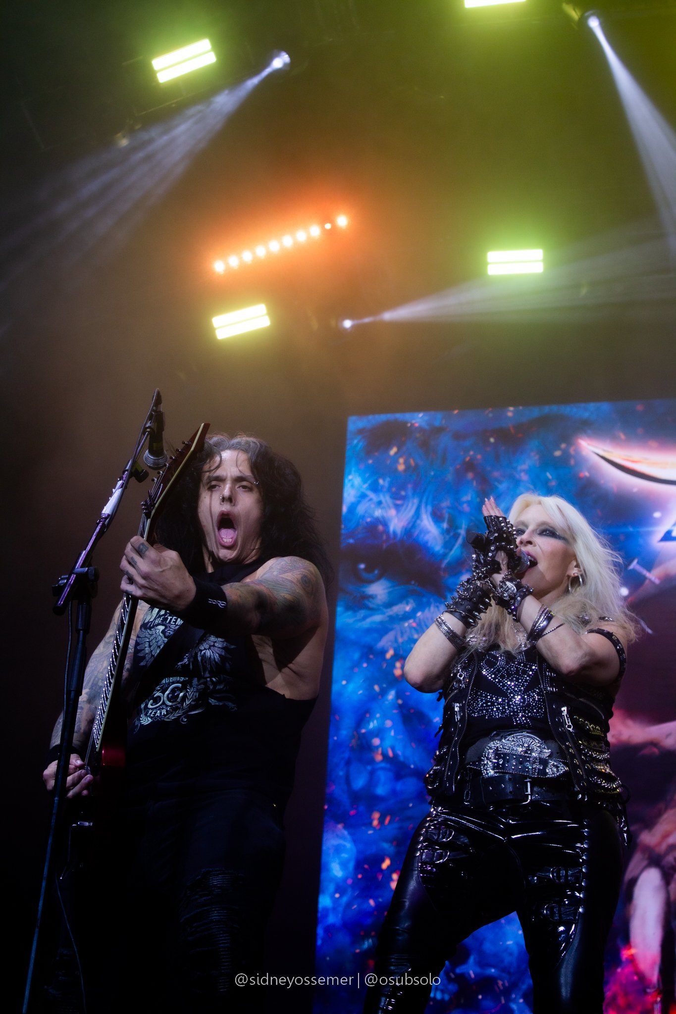 Com aquele backdrop digno dos anos 80, o metal tradicional ganhava força e coro em títulos como I Rule the Ruins, Burning the Witches, Für Immer e até mais “novas”, como Raise Your Fist in the Air. E, falando por novas, tivemos uma mais recente, de 2023, Fire in the Sky, que teve como co-compositor nosso Bill, a quem a rainha mostrava contínuo carinho e apreço, quase como se o mesmo fosse um reflexo do Brasil, na medida em que esta arriscava um português com algumas frases como “Vocês estão se divertindo?”, “Amo vocês” e “Estou muito feliz de vê-los novamente”.