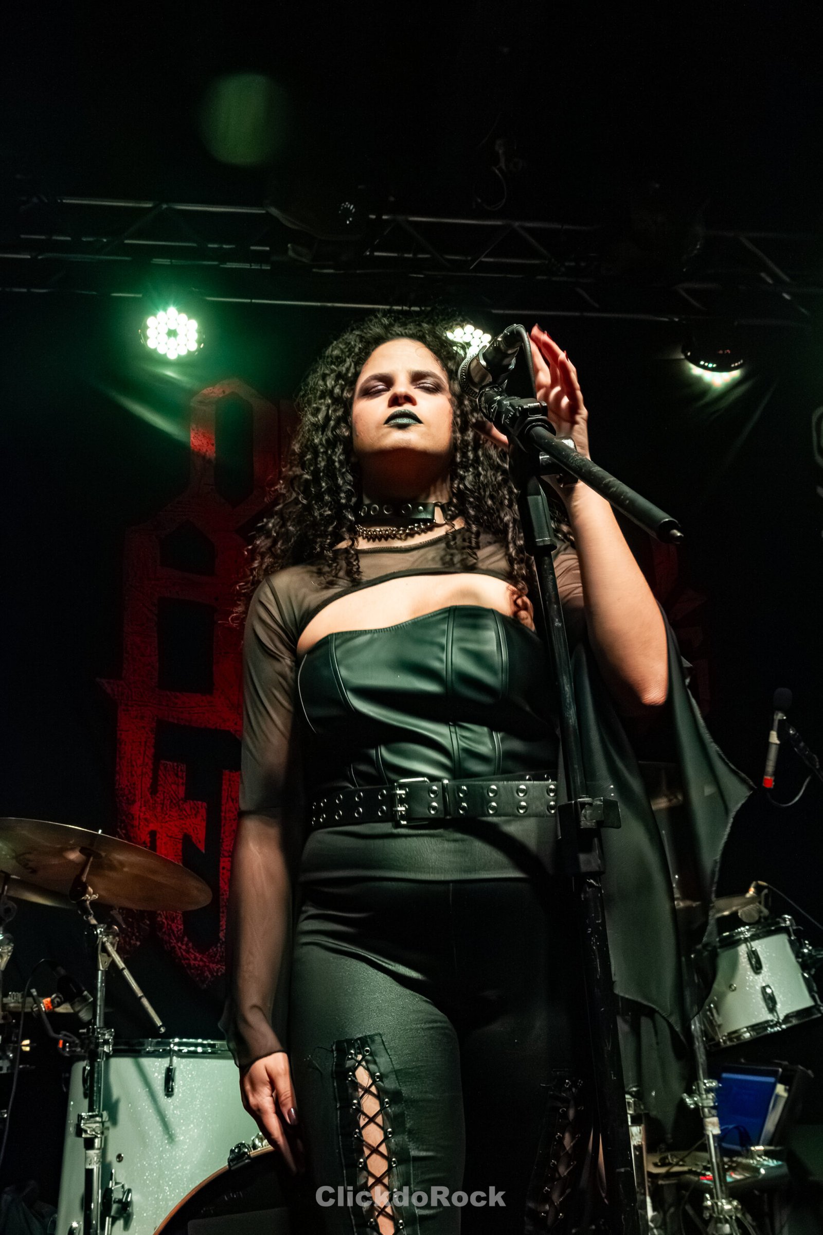 A segunda banda a subir ao palco foi a Old Audrey’s Funeral. Preciso dizer que o show foi intenso, pesado e denso. Das apresentações que já vi da banda, essa foi a melhor, contando com a nova vocalista Bruna Soares. A Old Audrey’s Funeral vem numa evolução gigante, notada e comentada por vários dos presentes no Caverna. A base do som da banda é o Heavy Metal, mas com uma bateria muito bem executada, tanto nas partes velozes quanto nas partes mais melódicas. Os vocais guturais, que me lembraram muito o Morten Veland (ex-Tristania, atual Sirenia), e os vocais líricos da Bruna Soares fazem a banda transitar por vários estilos dentro do Heavy Metal de maneira primorosa. Foi um show de encher os olhos, com o público colado, acompanhando, batendo cabeça e cantando junto. Com certeza, essa nova formação da Old Audrey’s Funeral tem tudo para evoluir cada vez mais e colocar a banda como um dos destaques nacionais.