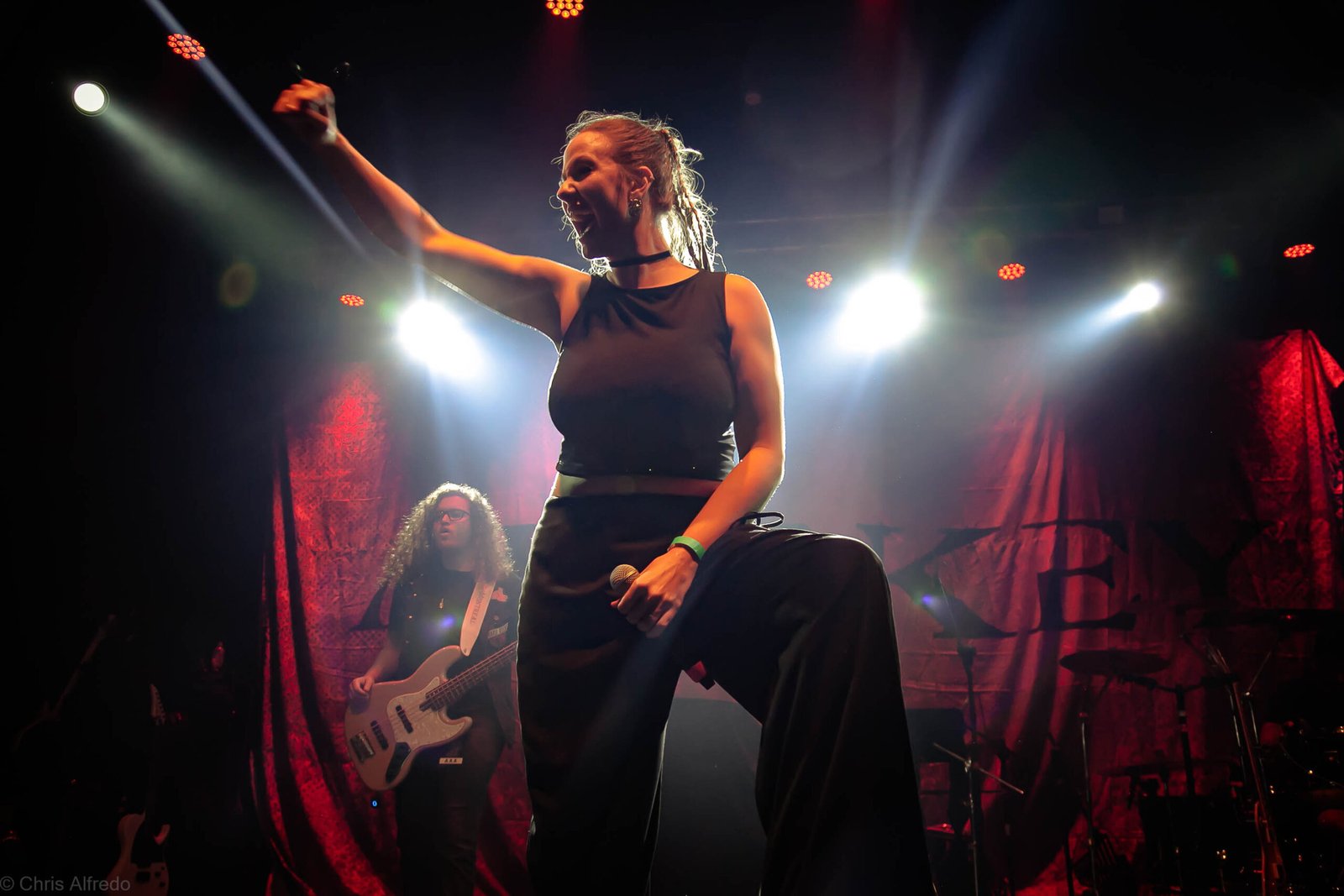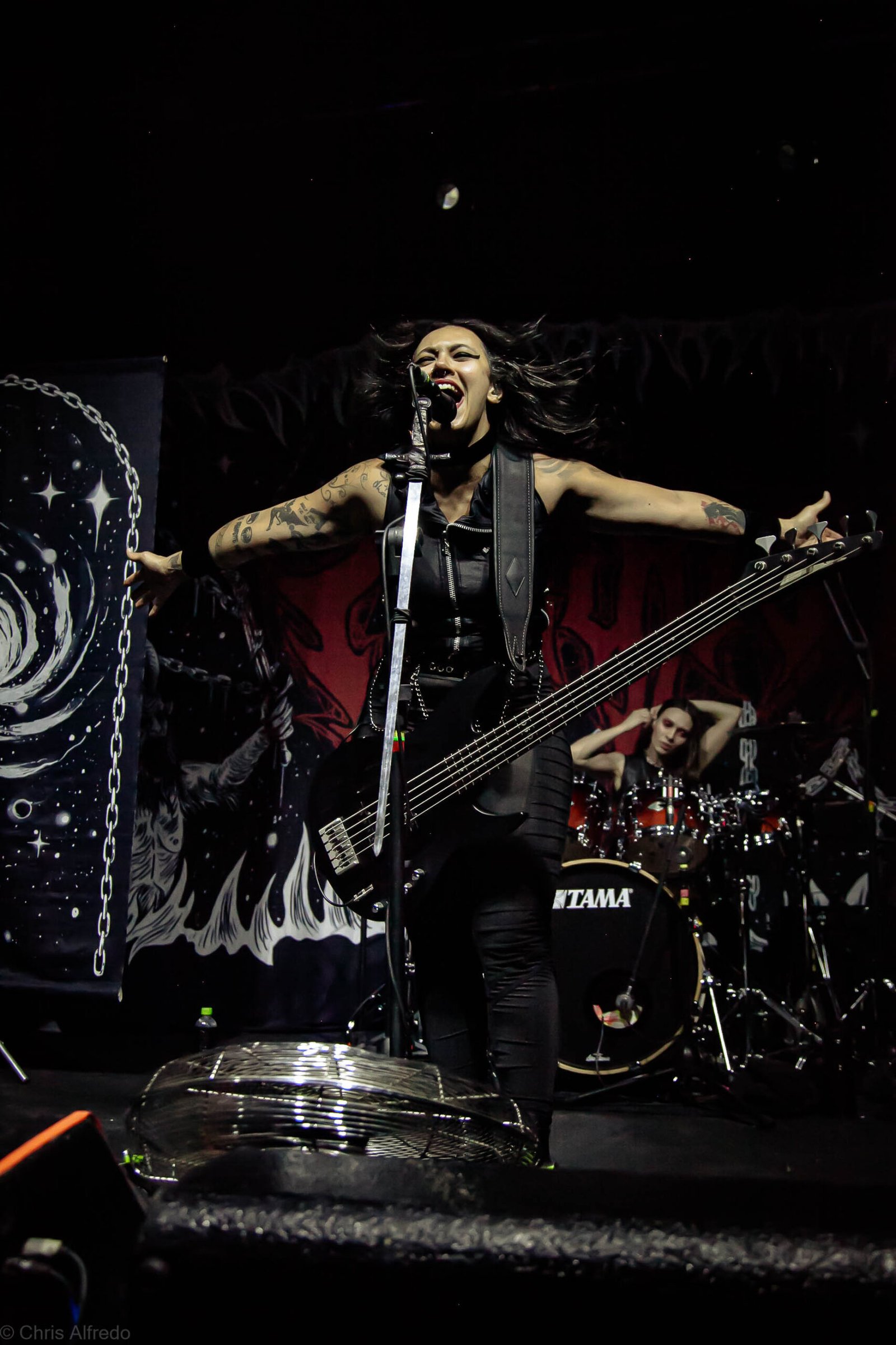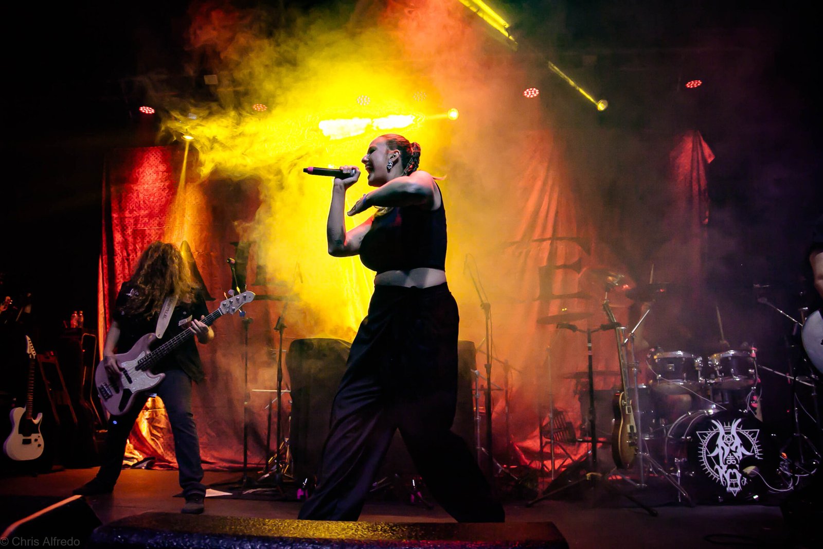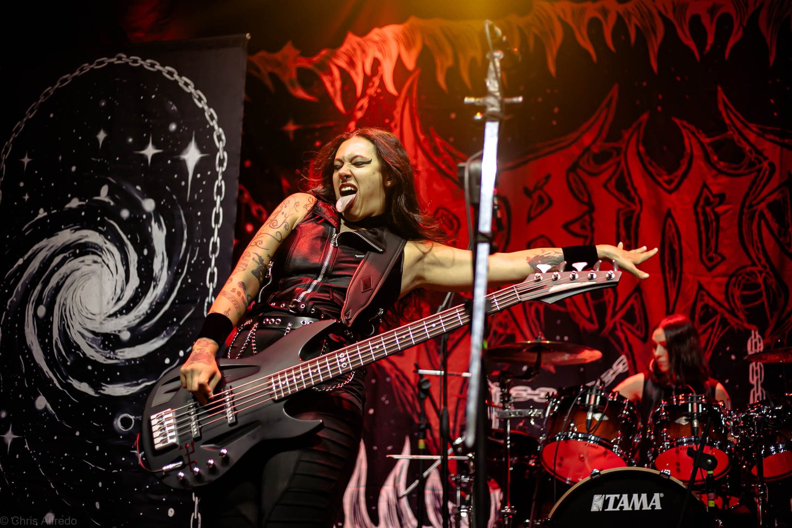 A vocalista Karina Menascé, sempre carismática, brincou com o clima: “Há um ano não vínhamos pra cá… e continua frio!”, disse entre risos, antes de se desculpar pelo atraso e agradecer pela paciência da plateia. Durante o show, fez todo mundo bater cabeça e até puxou uma death wall de respeito, daquelas que transformam qualquer espectador em fã instantâneo.