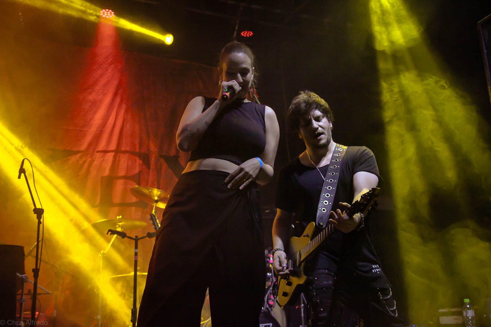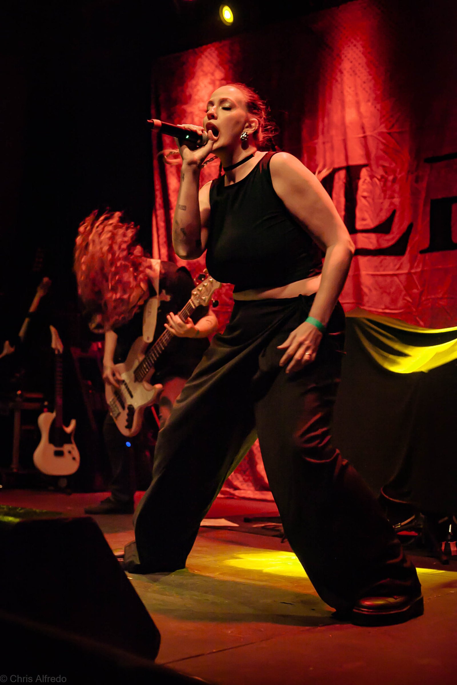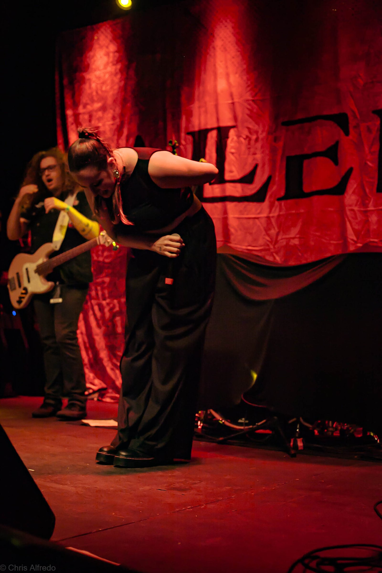 A vocalista Karina Menascé, sempre carismática, brincou com o clima: “Há um ano não vínhamos pra cá… e continua frio!”, disse entre risos, antes de se desculpar pelo atraso e agradecer pela paciência da plateia. Durante o show, fez todo mundo bater cabeça e até puxou uma death wall de respeito, daquelas que transformam qualquer espectador em fã instantâneo.