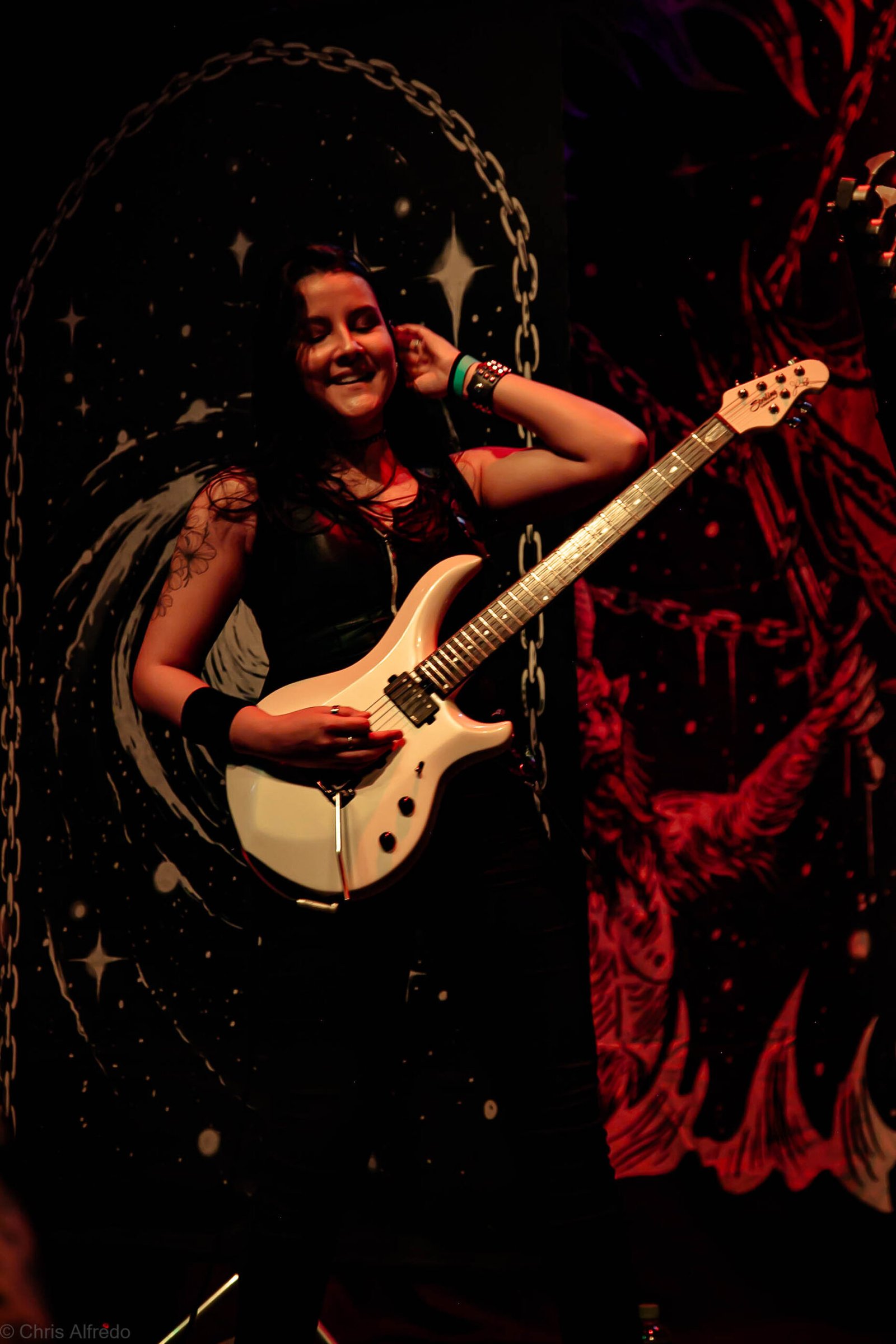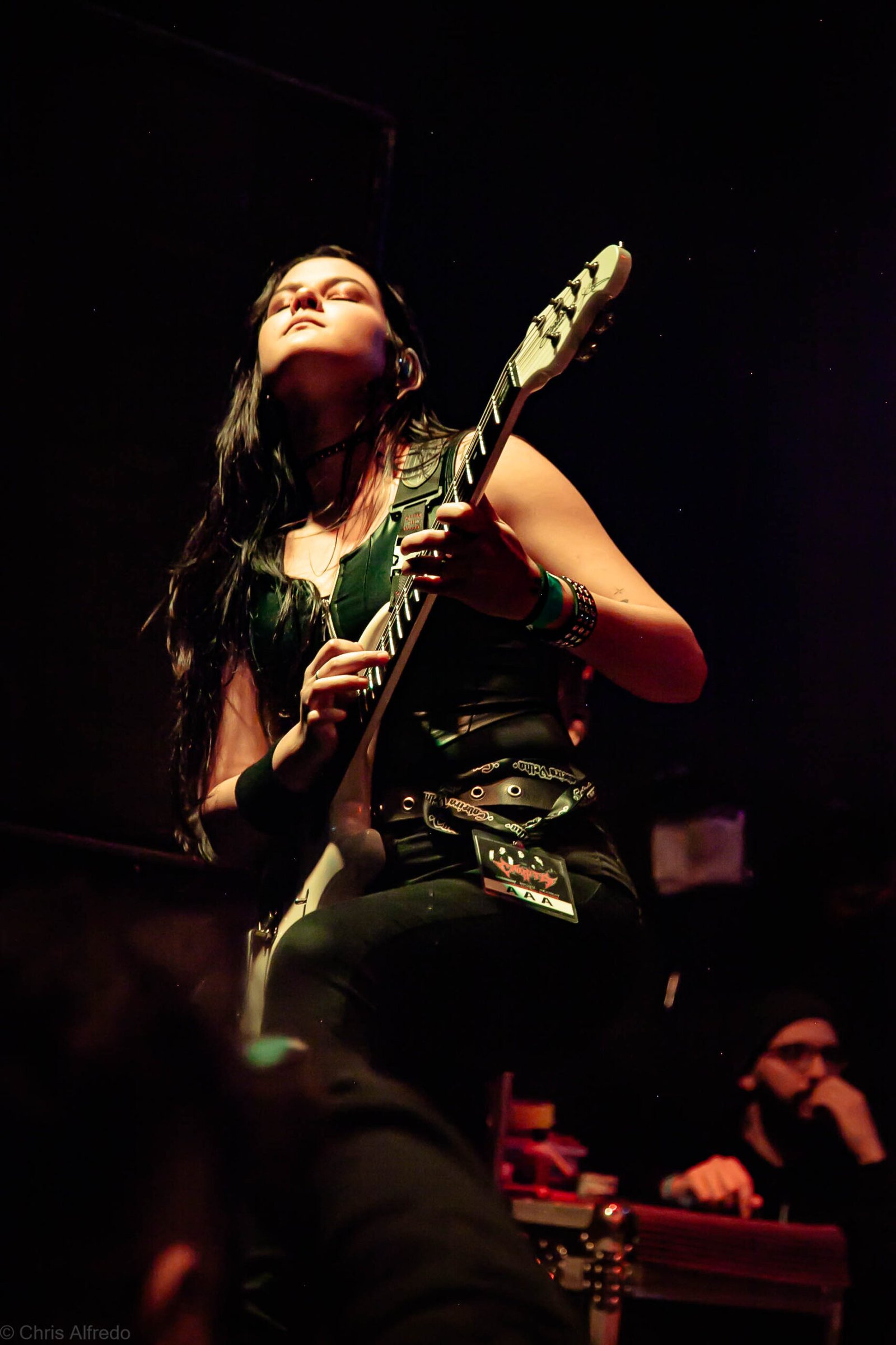 Outro destaque da noite foi a estreia da nova guitarrista de turnê, Helena Nagagata, que assumiu o posto deixado por Jéssica di Falchi. Com presença de palco segura e execuções precisas, Helena conquistou o público já nas primeiras músicas, reforçando que a nova formação está mais sólida do que nunca.