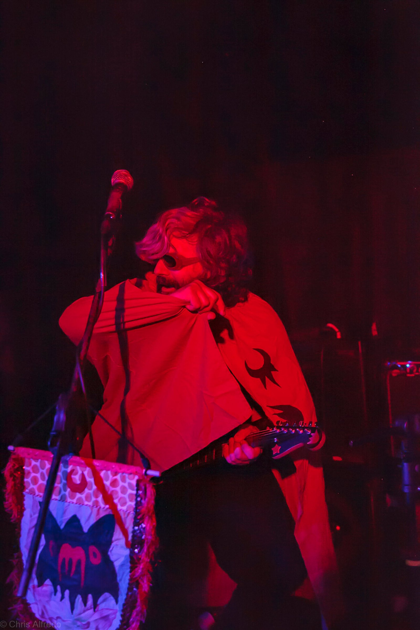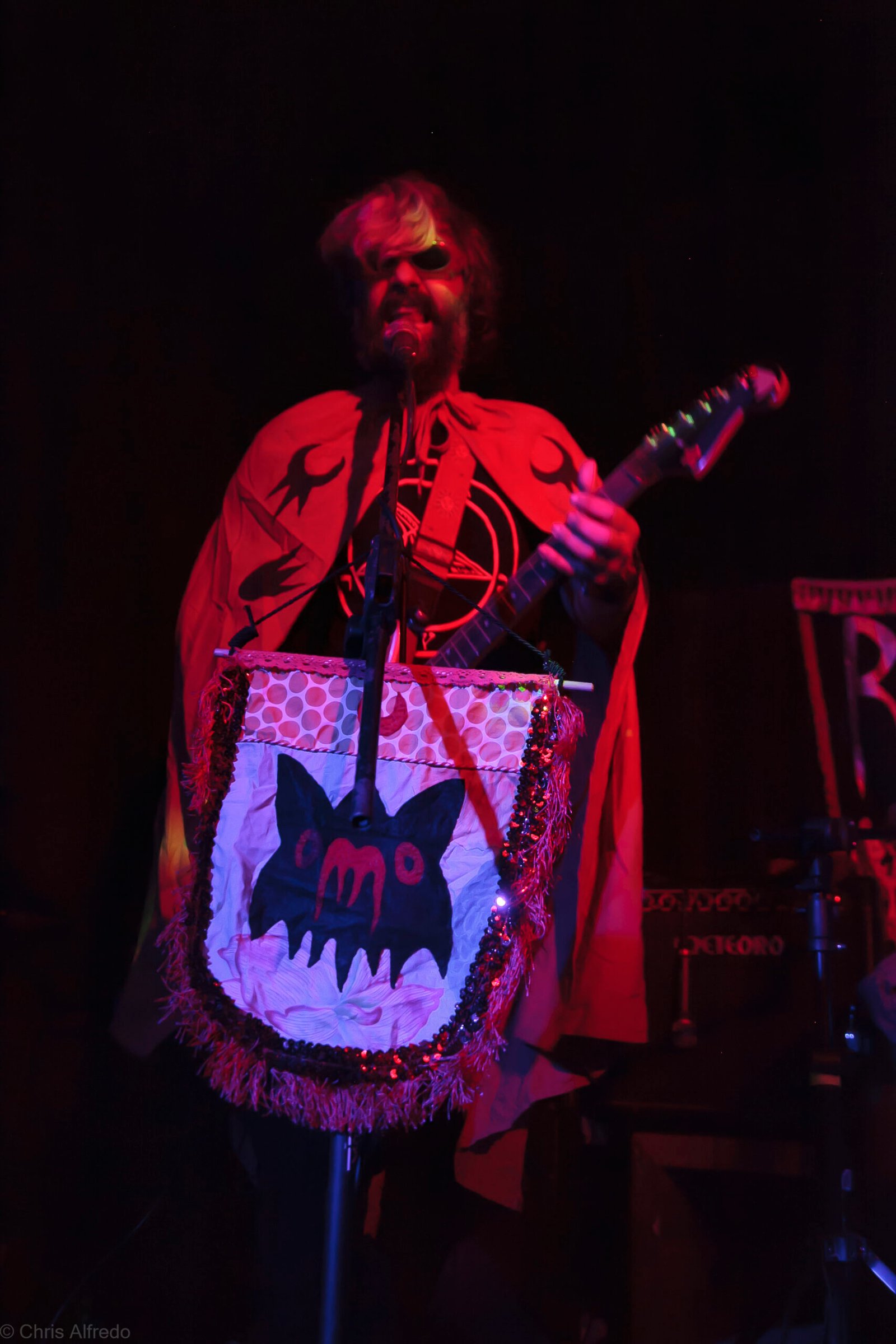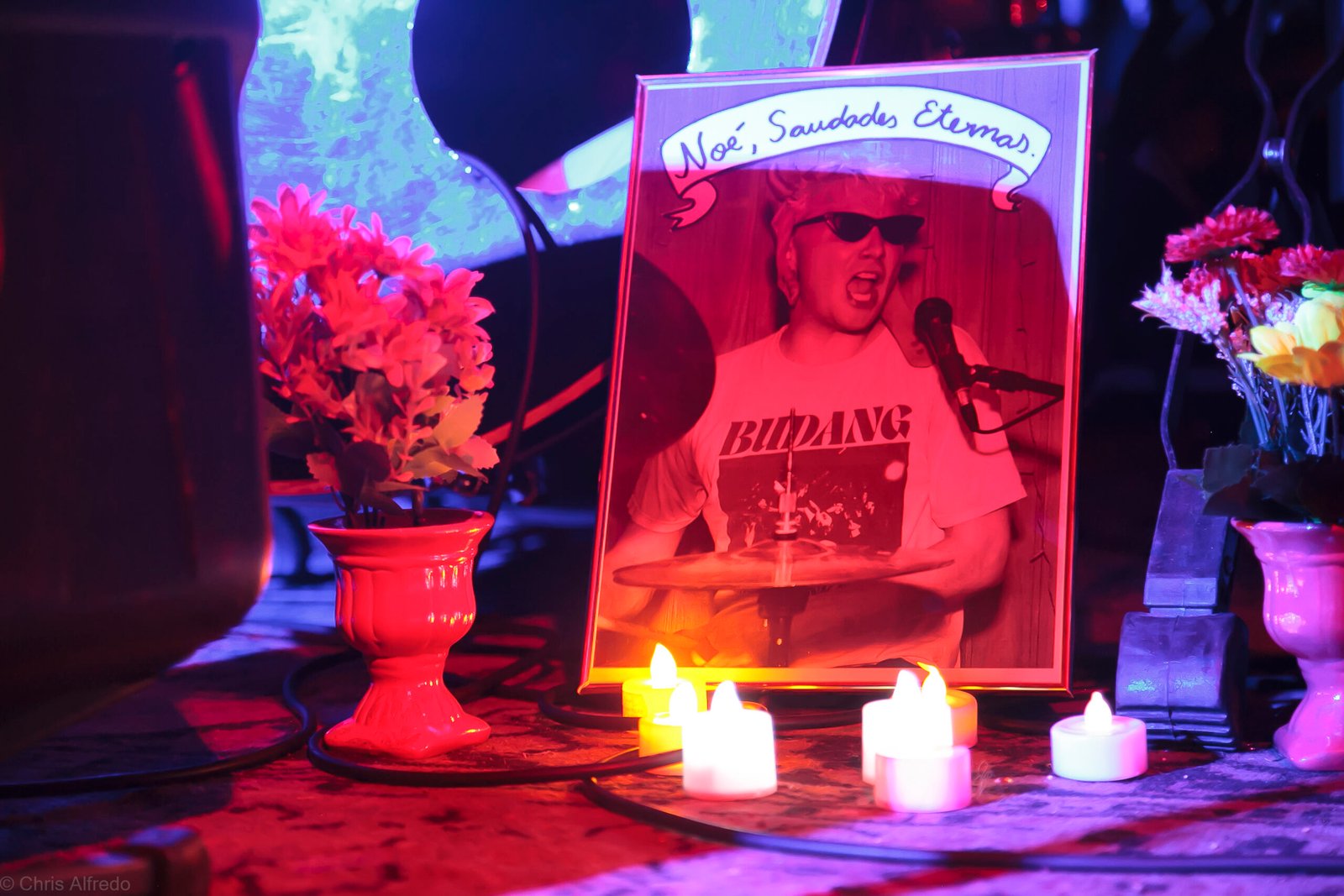 A partir desse momento, a atmosfera se transformou. O espetáculo se tornou uma espécie de rito fúnebre performático, onde cada acorde reverberava como um lamento, e cada distorção de guitarra parecia evocar a presença ausente de Noé. O palco cuidadosamente adornado, entre o sombrio e o kitsch, reforçava a estética singular da Retromorcego: uma mistura de sarcasmo, melancolia e intensidade espiritual.
