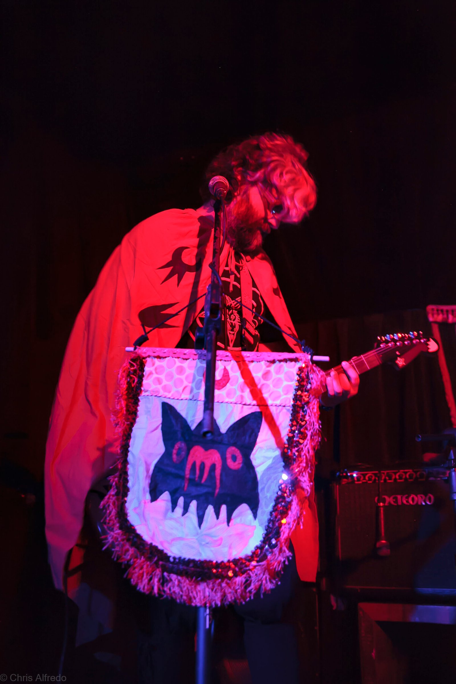 Na apresentação em Curitiba, apenas Koostella subiu ao palco, transformando a ausência física de seu parceiro em um elemento central do espetáculo. O show começou com uma introdução ritualística, envolta em misticismo e teatralidade. Em meio à penumbra, o músico distribuiu folhetos com as letras das músicas ao público, convidando todos a participar da cerimônia. Diante de um mini altar decorado com flores, velas artificiais e uma foto do baterista Noé, o artista anunciou com ironia e emoção: