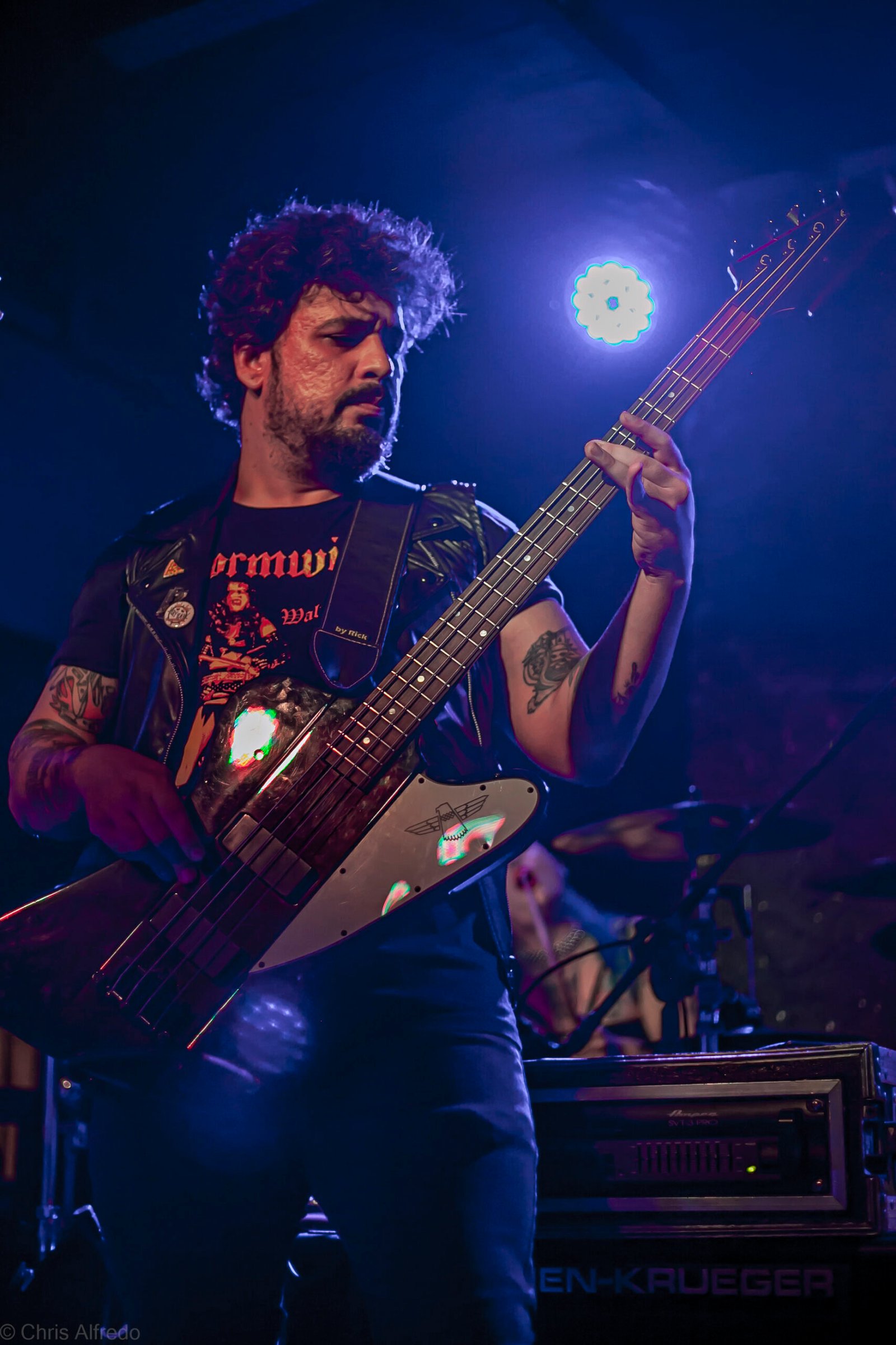 Em seguida, foi a vez dos mineiros da Pesta, banda também de Stoner/Doom, que vinha sendo muito aguardada nos palcos curitibanos. A expectativa era mútua, conforme mencionado pelo vocalista Thiago Cruz, já que a fama de Curitiba como à cidade mais Rock’n’Roll tem furado a bolha regional e se espalhado pelo Brasil. No palco, todos os integrantes tiveram presença marcante, seja pela psicodelia de Thiago com seu lenço esvoaçante, pela inegável tranquilidade nos olhos do guitarrista Marcos Resende, pelas caretas do baterista Flavio Freitas, ou pelo fato curioso do baixista Anderson Vaca tocar com o baixo de ponta-cabeça. Ao final do show, perguntei a ele o motivo disso e, como eu já imaginava, no início de seus estudos, os modelos adaptados para canhotos eram caros e de difícil acesso. Assim, aprender a tocar com o instrumento invertido foi a solução mais viável, uma grande demonstração de talento na minha opinião. A Pesta nos presenteou com uma belíssima amostra de seu potencial, e tenho certeza de que eles deixam Curitiba com muitos fãs ansiosos para vê-los novamente na cidade.