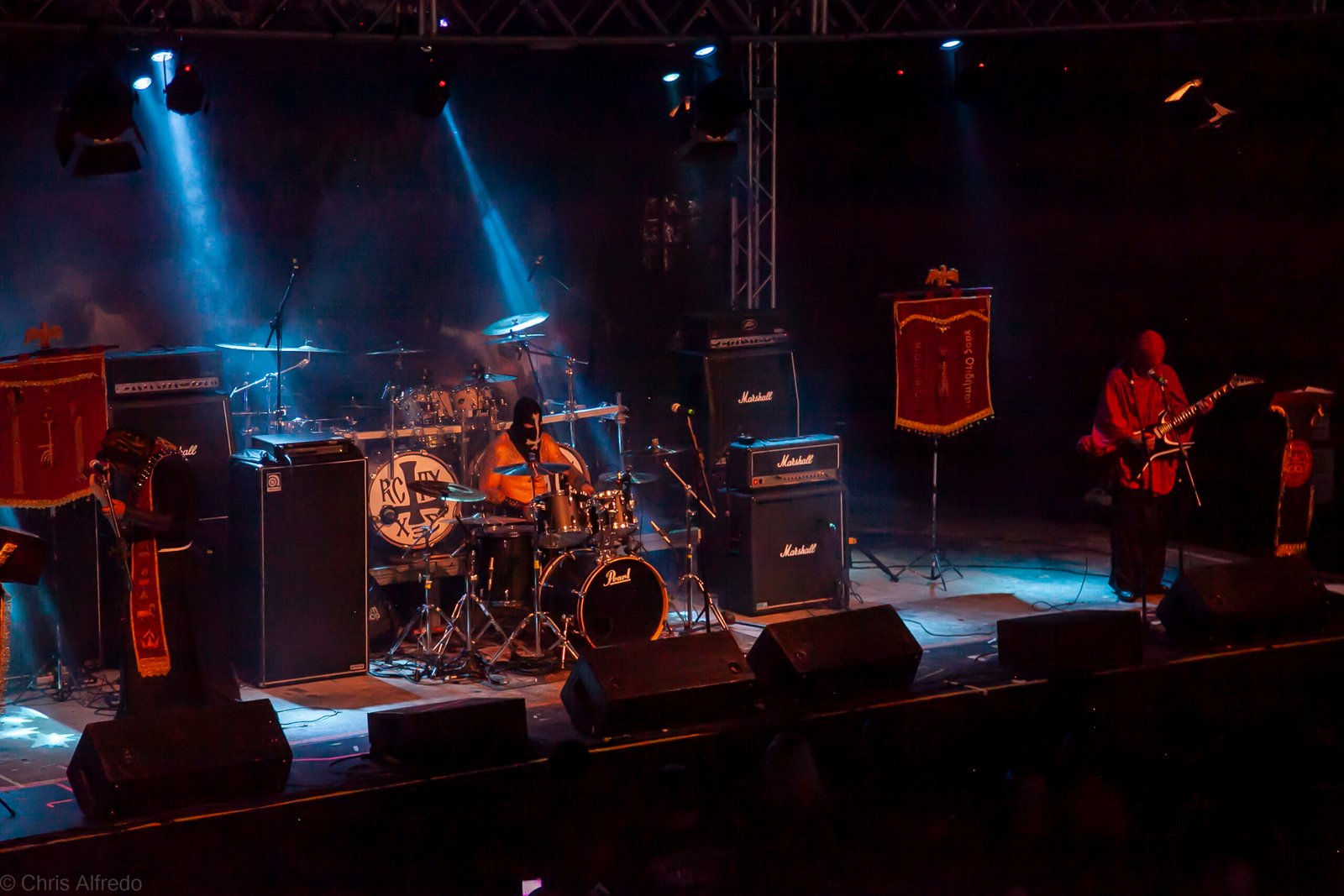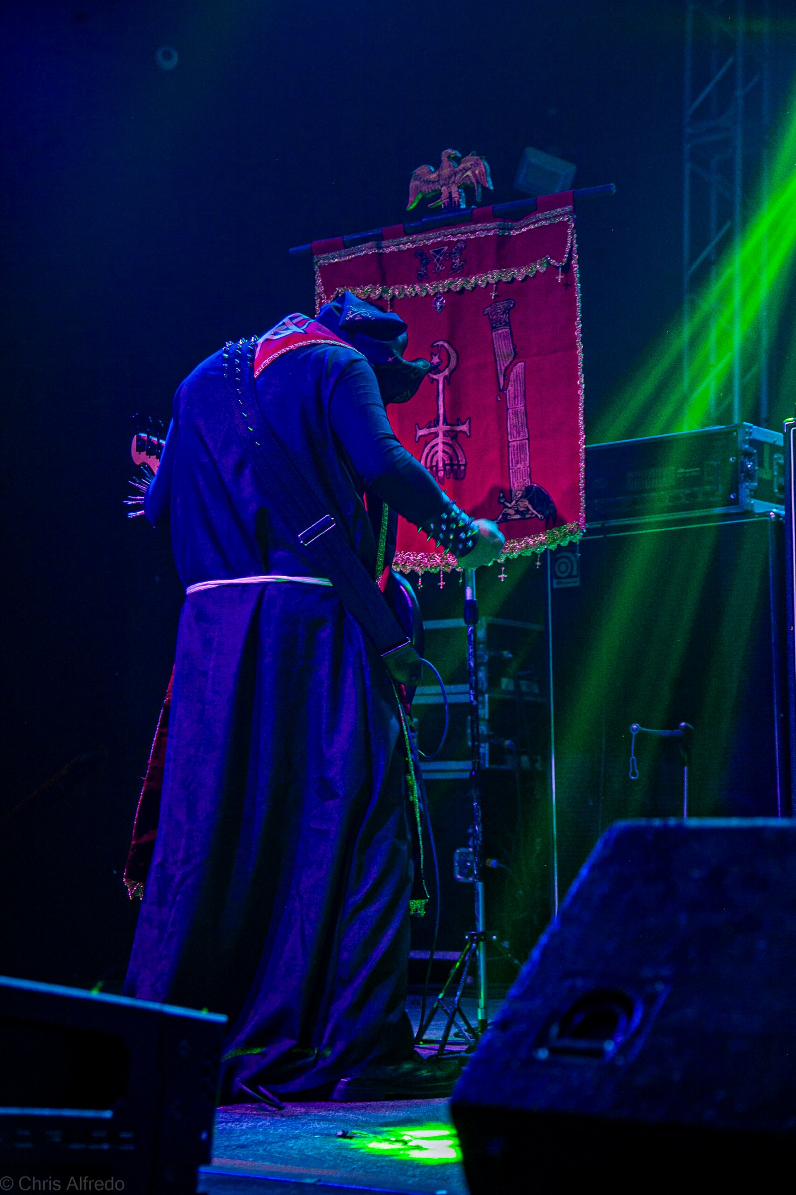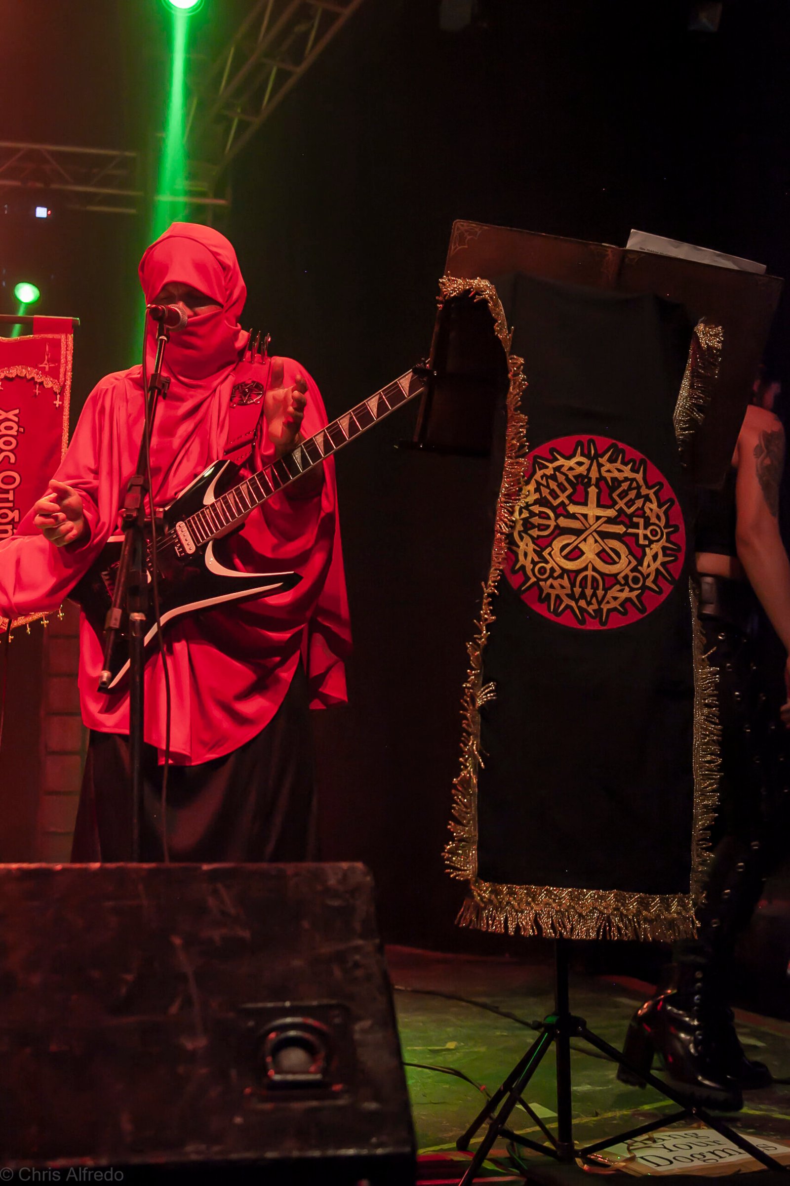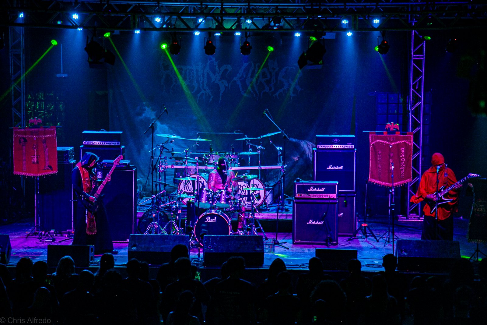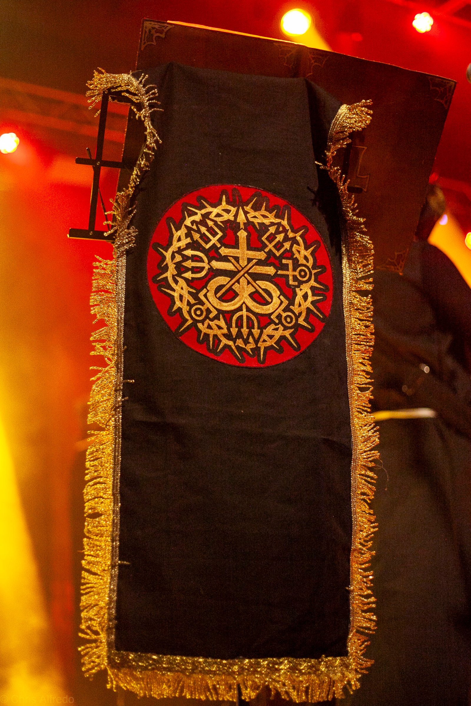 Com o horário da abertura dos portões marcado para as 19h, o público foi chegando aos poucos, adentrando o recinto com calma e sem filas ou tumultos, o que ocasionou também uma grande chance para quem é fã de ficar na grade, uma boa oportunidade para escolher o lugar que mais lhe agrada, uma vez que o destino da maioria que entrava era o grande balcão circular do bar que separa a pista e a espaçosa praça de alimentação da casa. Com a refrigeração em sua potência máxima e cerveja extremamente gelada, foi fácil esquecer o calor infernal que estava lá fora, pelo menos por uns minutos… No palco, viam-se púlpitos com livros que pareciam bíblias e bandeiras com símbolos associados a cultos pagãos, visão que anunciava que a noite seria exatamente isso, uma noite de grande blasfêmia.