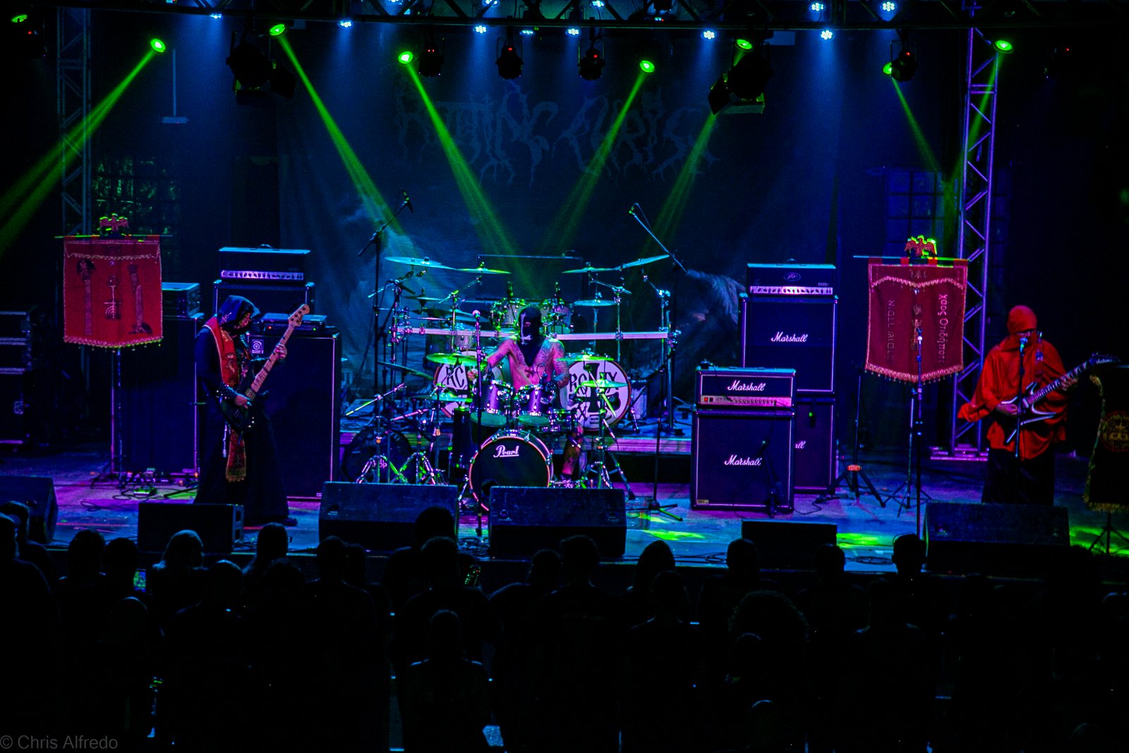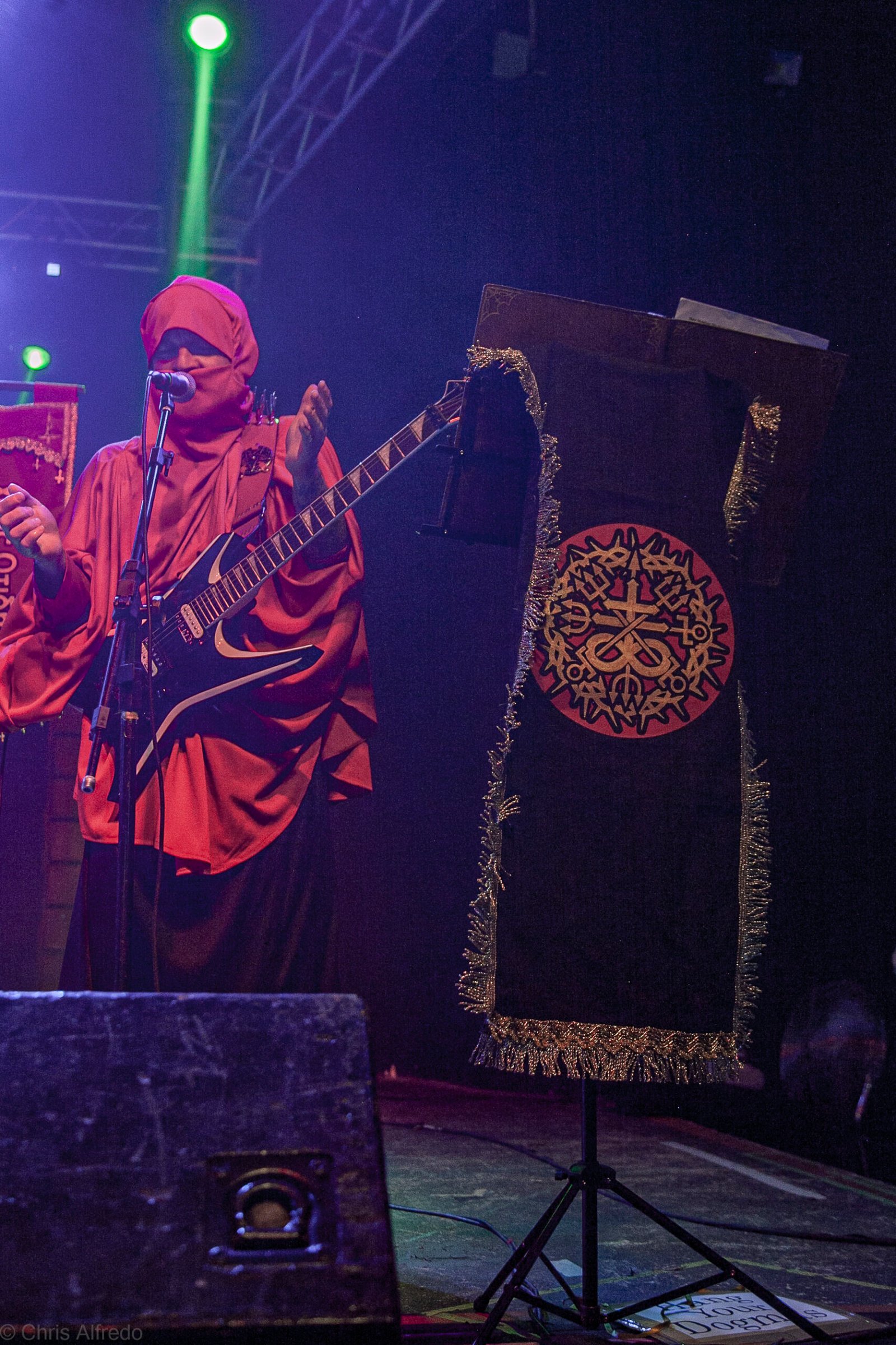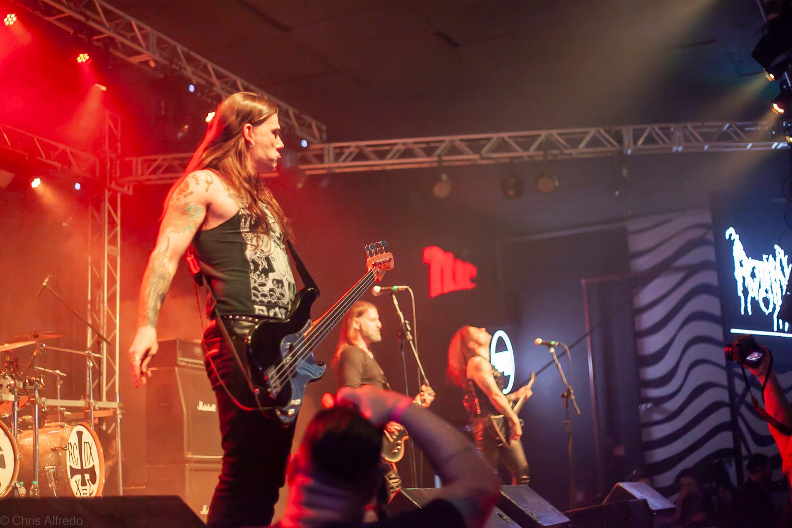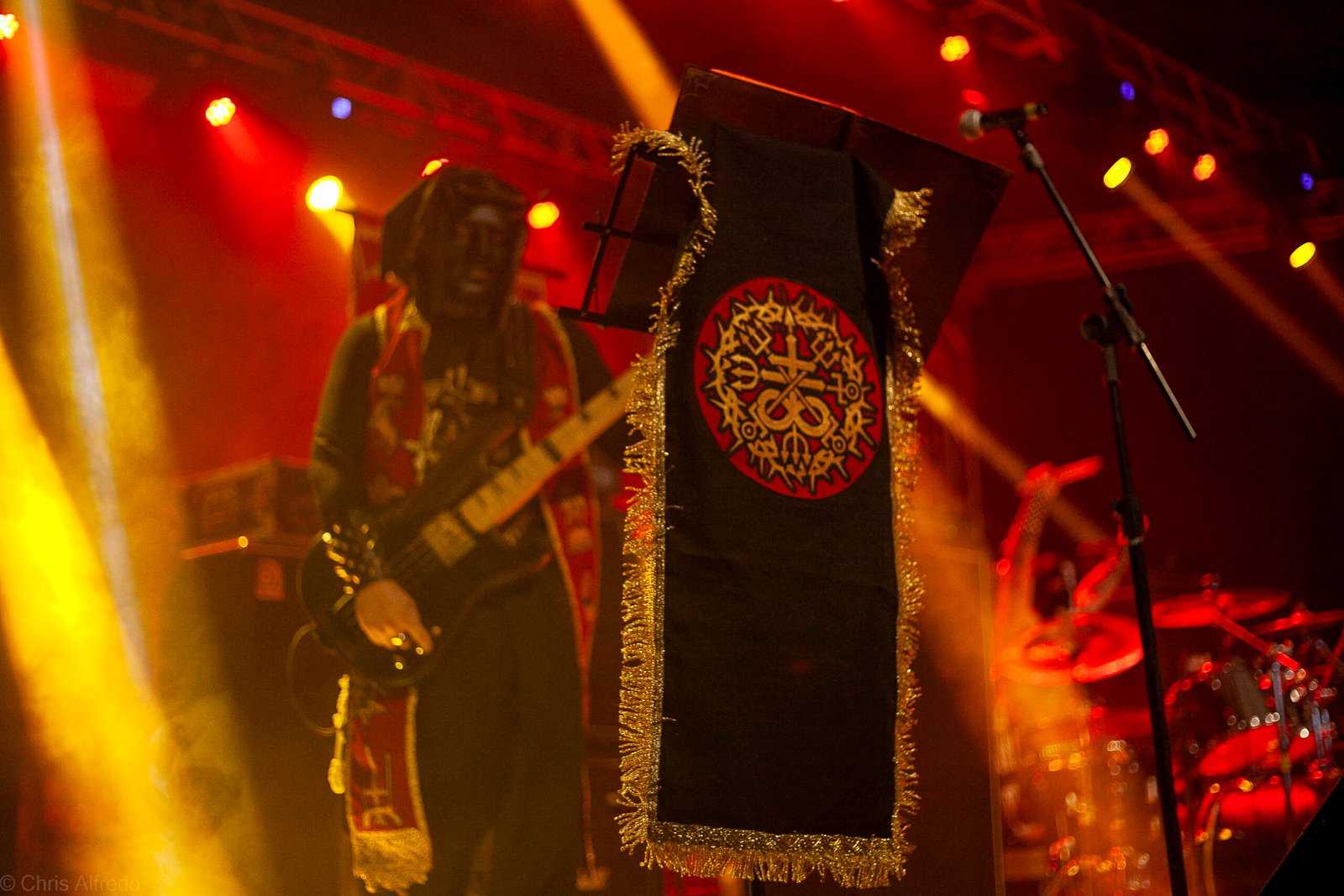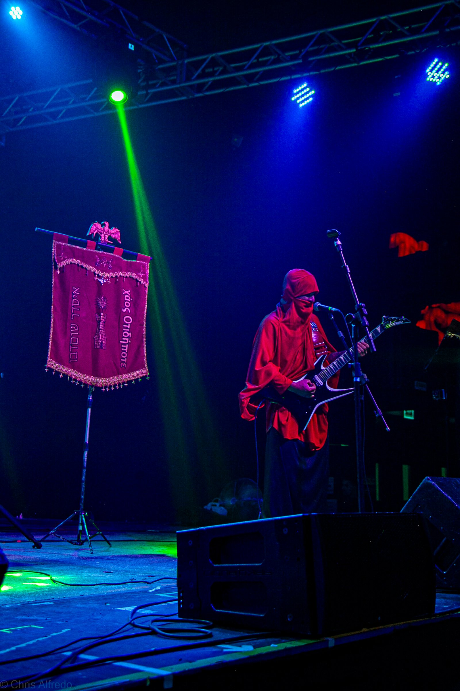 Com o horário da abertura dos portões marcado para as 19h, o público foi chegando aos poucos, adentrando o recinto com calma e sem filas ou tumultos, o que ocasionou também uma grande chance para quem é fã de ficar na grade, uma boa oportunidade para escolher o lugar que mais lhe agrada, uma vez que o destino da maioria que entrava era o grande balcão circular do bar que separa a pista e a espaçosa praça de alimentação da casa. Com a refrigeração em sua potência máxima e cerveja extremamente gelada, foi fácil esquecer o calor infernal que estava lá fora, pelo menos por uns minutos… No palco, viam-se púlpitos com livros que pareciam bíblias e bandeiras com símbolos associados a cultos pagãos, visão que anunciava que a noite seria exatamente isso, uma noite de grande blasfêmia.