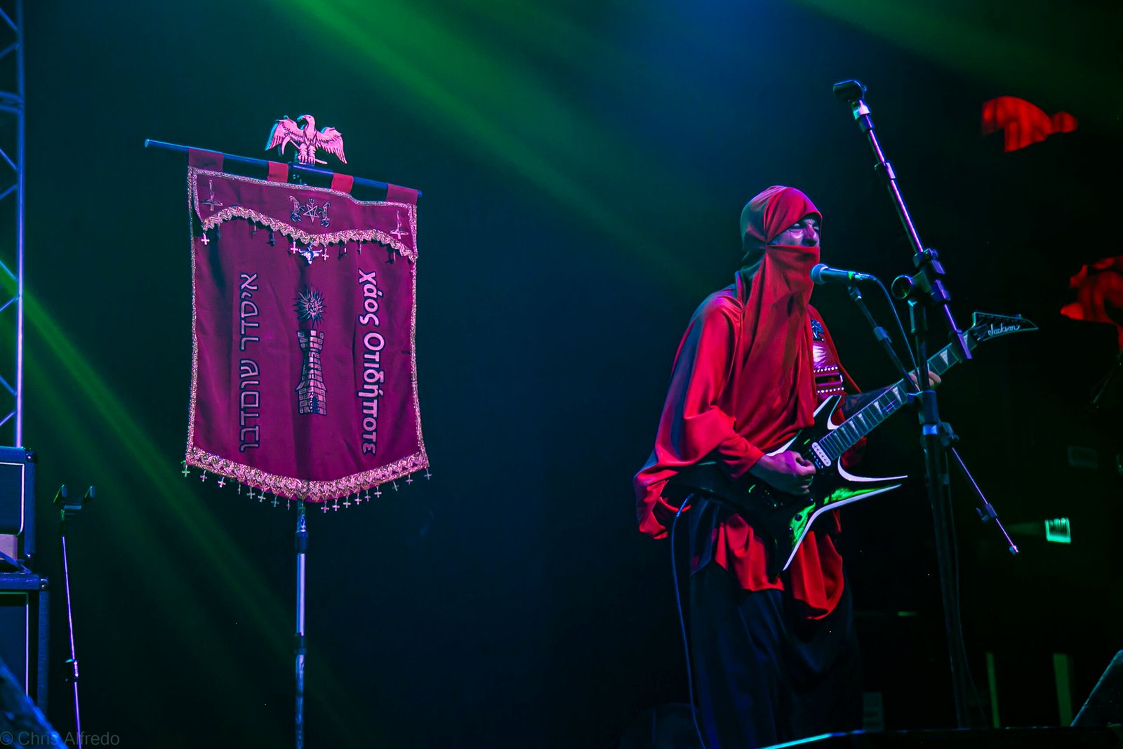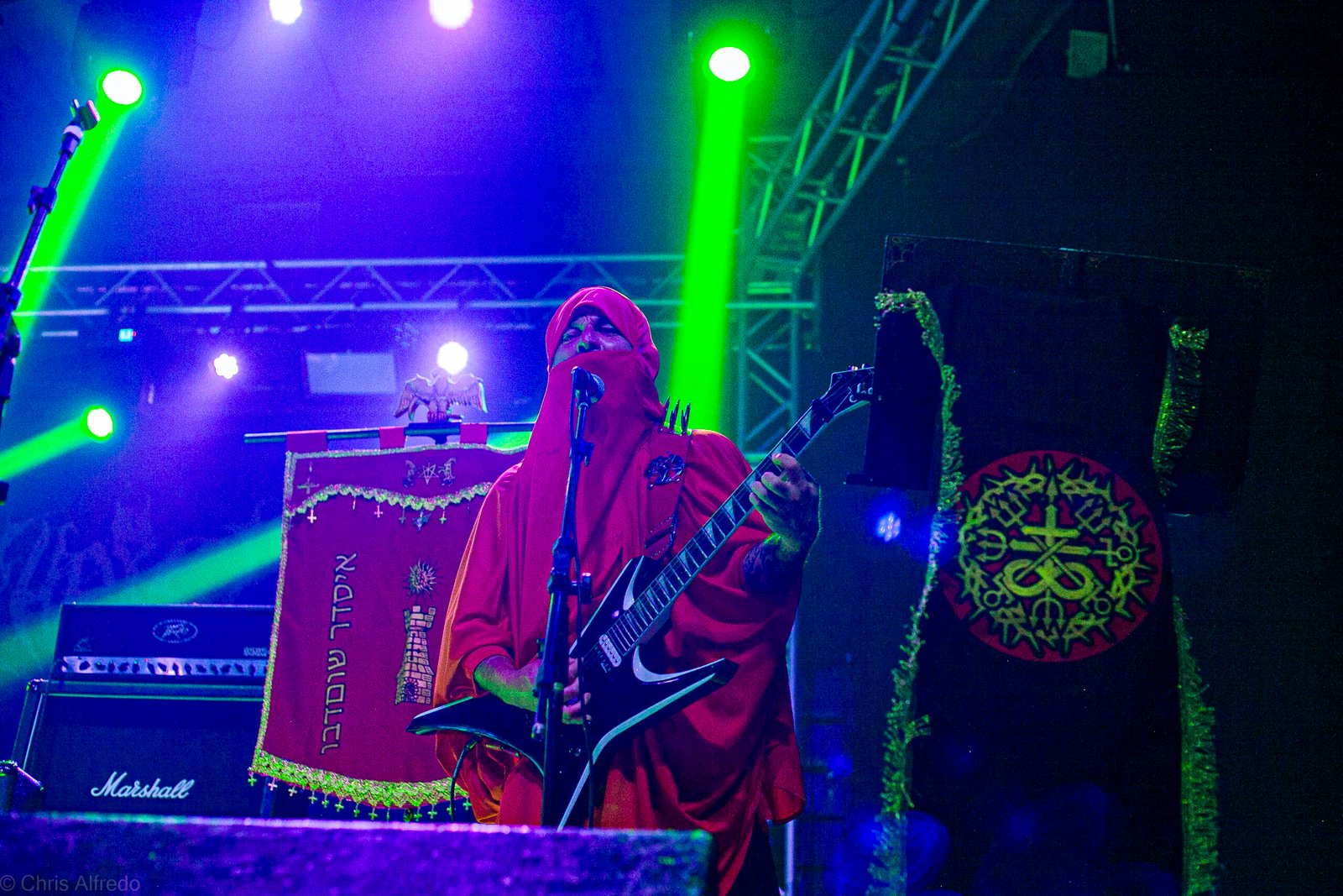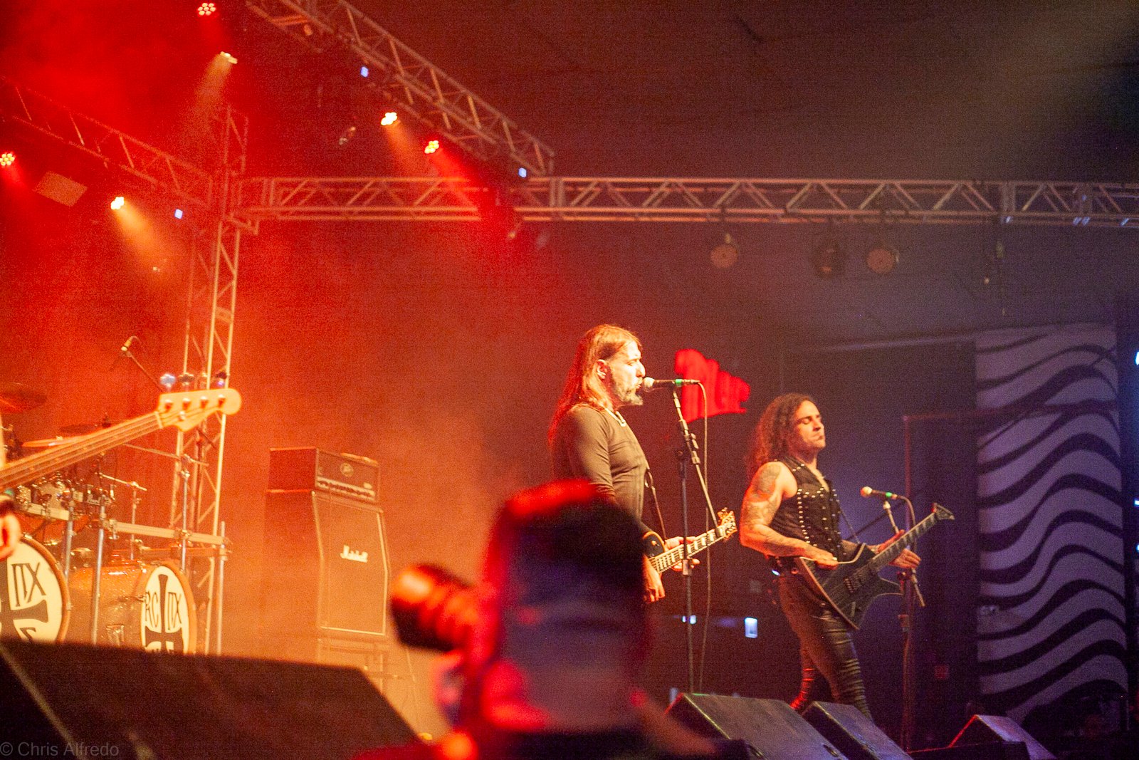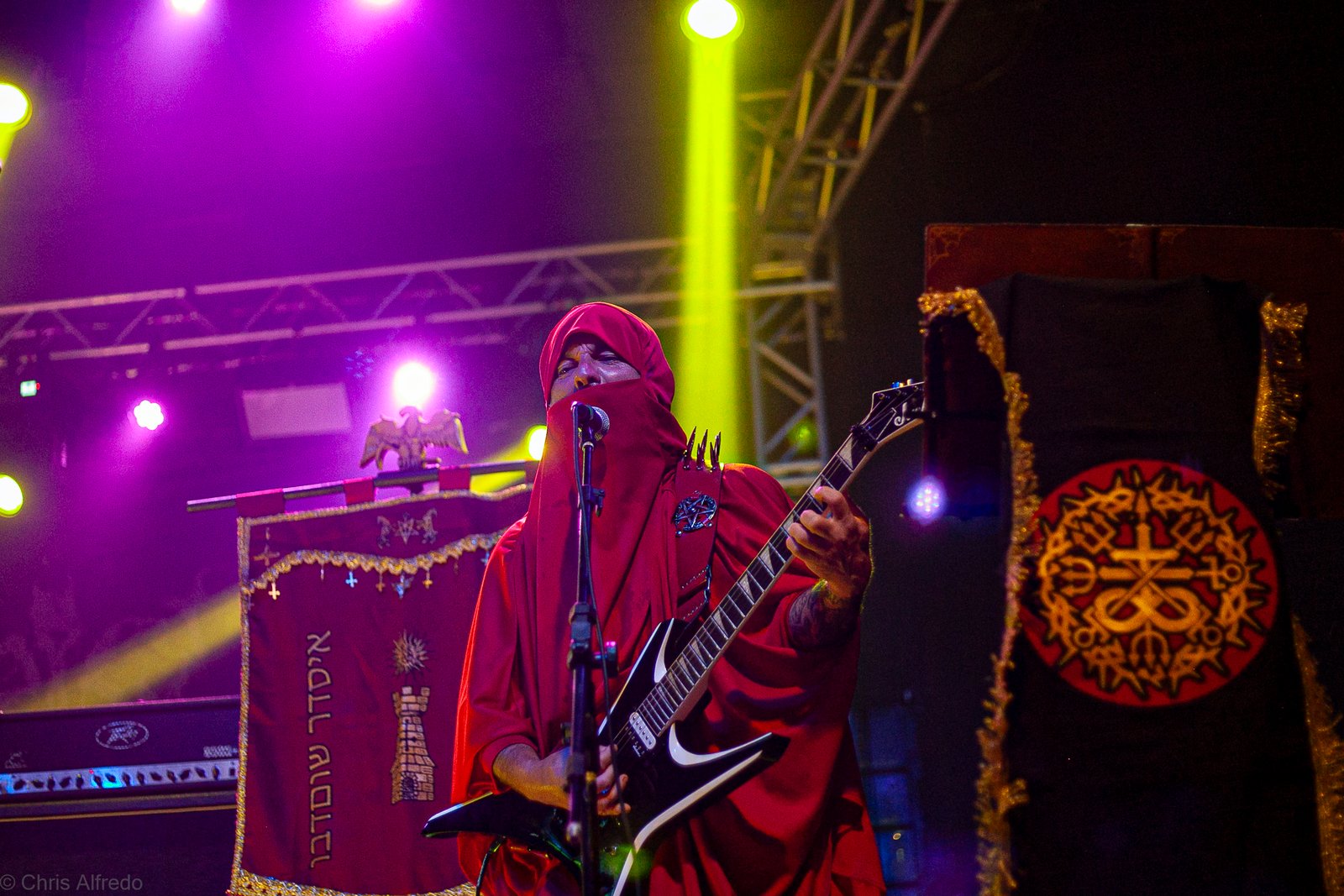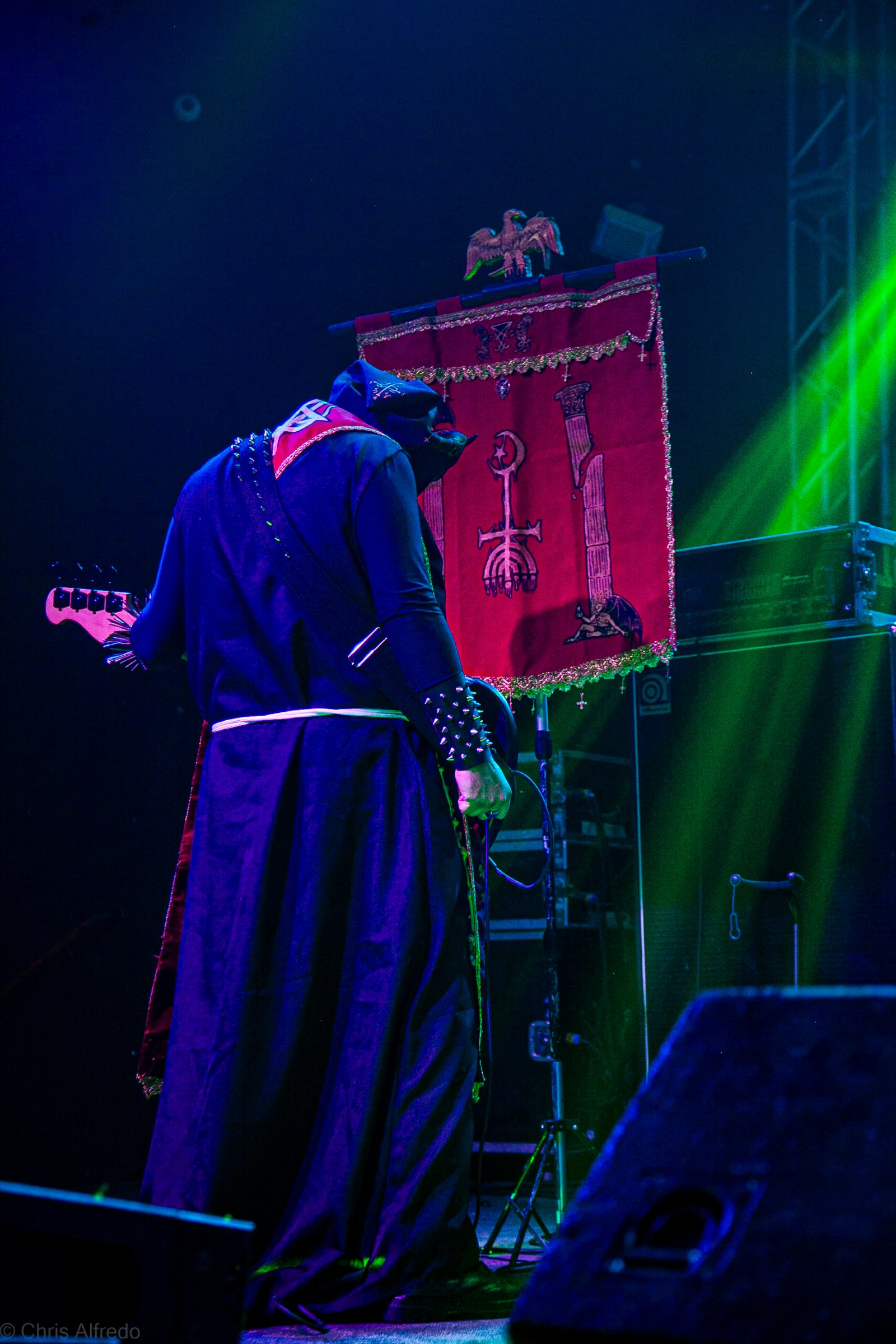 Com o horário da abertura dos portões marcado para as 19h, o público foi chegando aos poucos, adentrando o recinto com calma e sem filas ou tumultos, o que ocasionou também uma grande chance para quem é fã de ficar na grade, uma boa oportunidade para escolher o lugar que mais lhe agrada, uma vez que o destino da maioria que entrava era o grande balcão circular do bar que separa a pista e a espaçosa praça de alimentação da casa. Com a refrigeração em sua potência máxima e cerveja extremamente gelada, foi fácil esquecer o calor infernal que estava lá fora, pelo menos por uns minutos… No palco, viam-se púlpitos com livros que pareciam bíblias e bandeiras com símbolos associados a cultos pagãos, visão que anunciava que a noite seria exatamente isso, uma noite de grande blasfêmia.