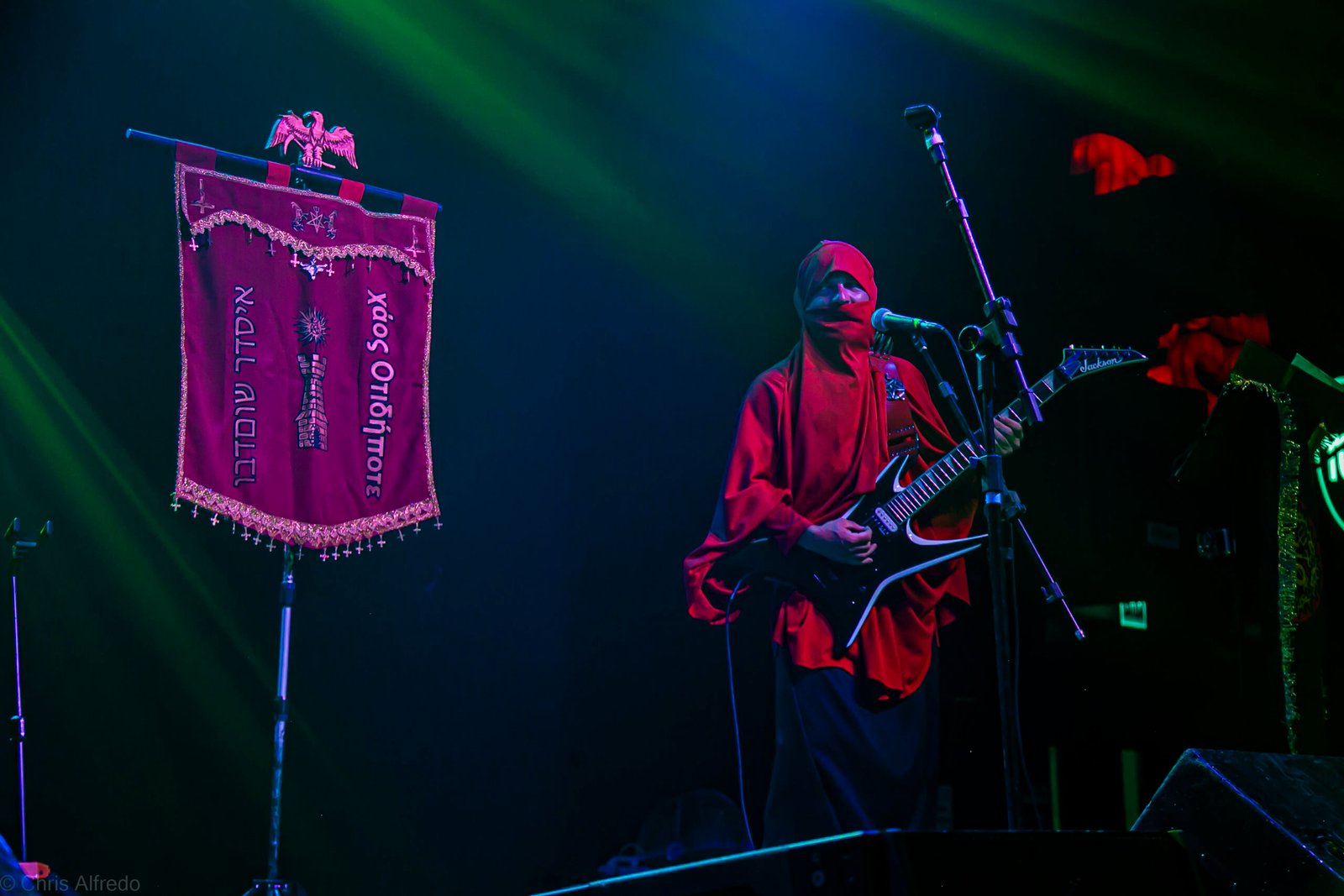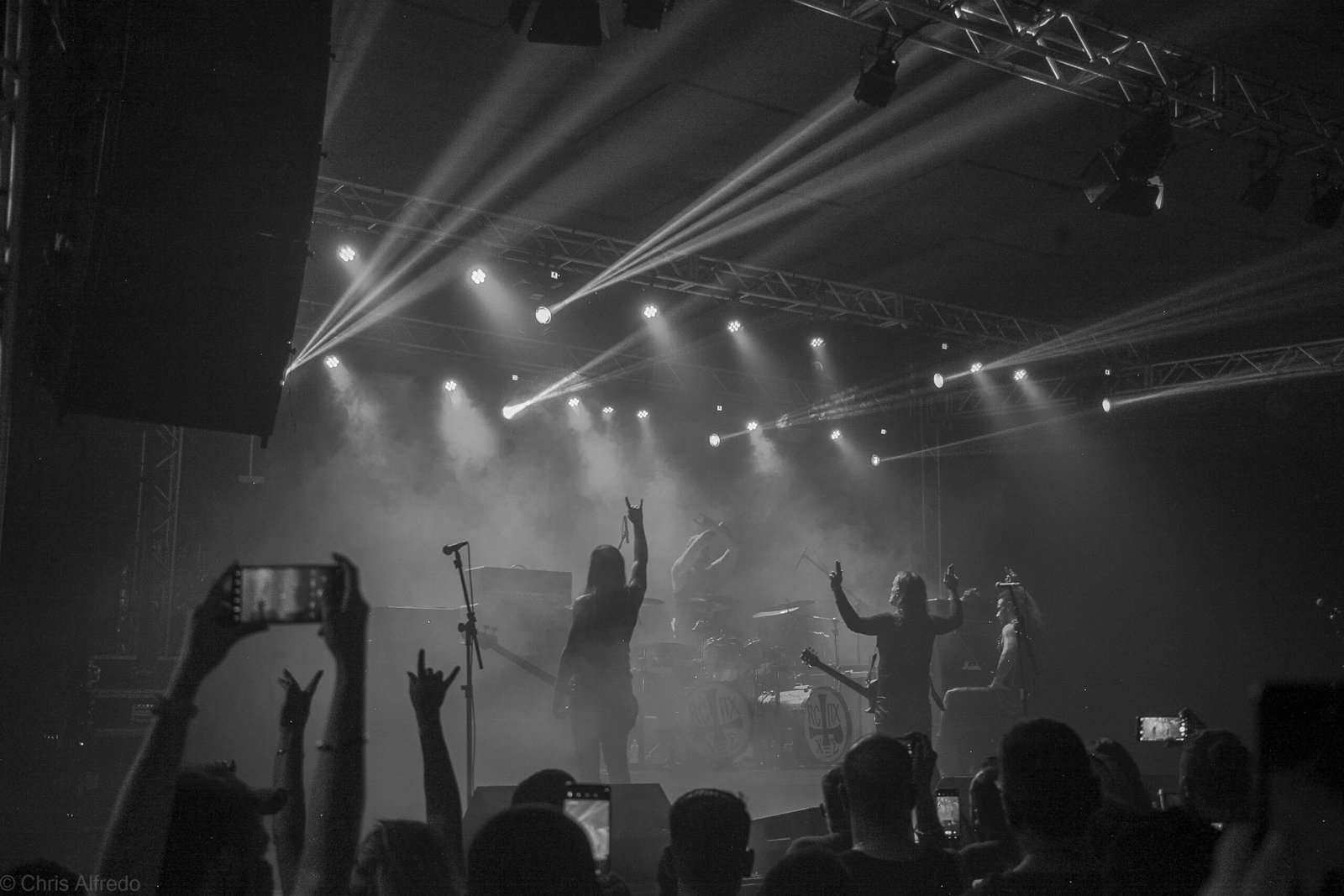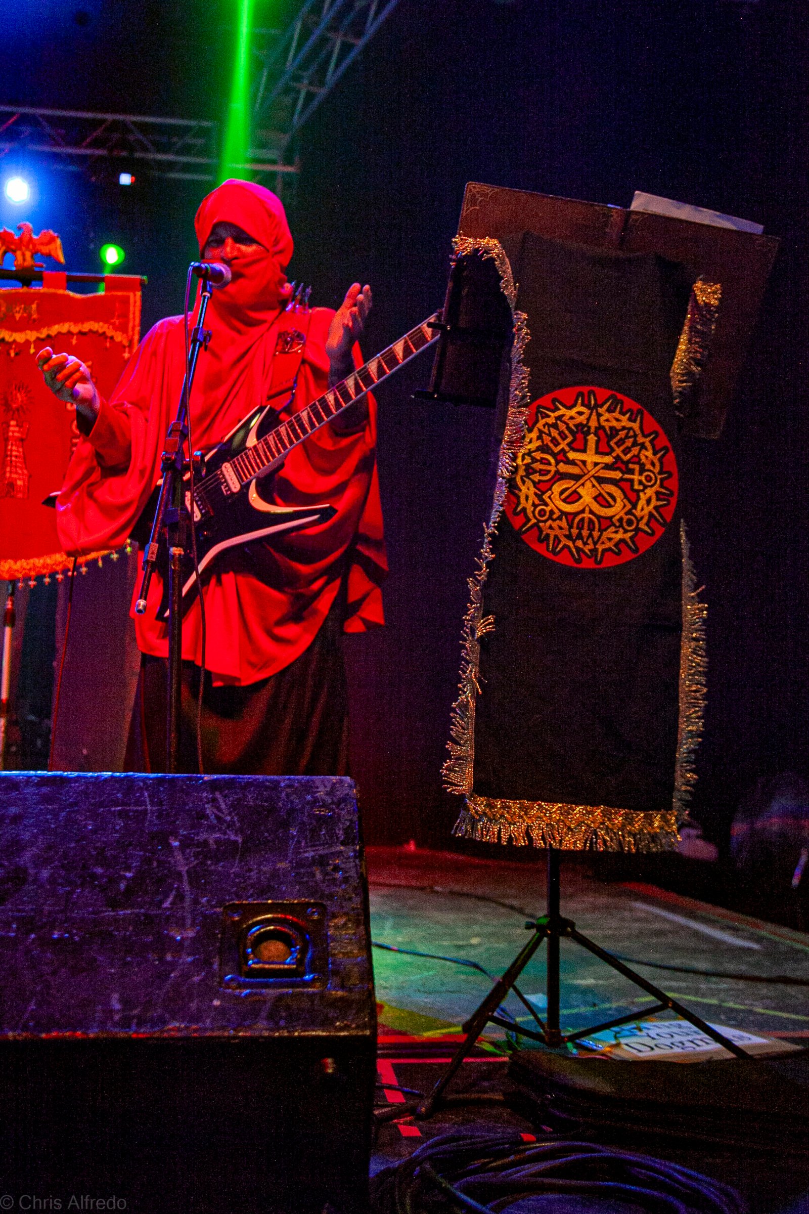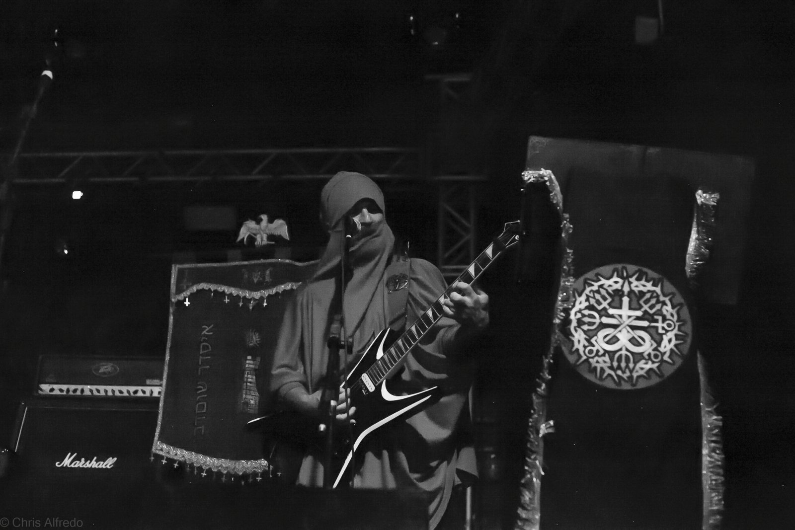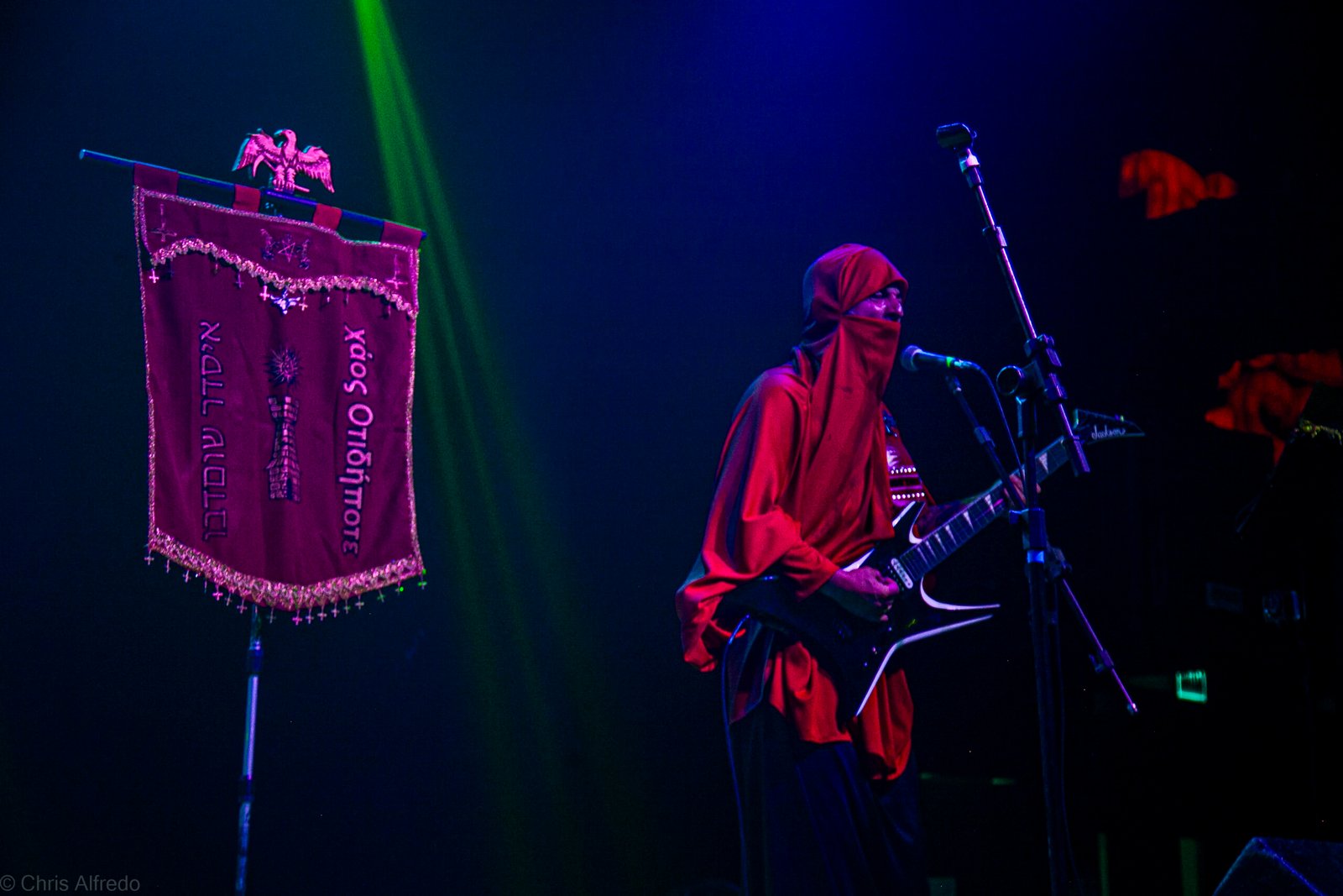 Com o horário da abertura dos portões marcado para as 19h, o público foi chegando aos poucos, adentrando o recinto com calma e sem filas ou tumultos, o que ocasionou também uma grande chance para quem é fã de ficar na grade, uma boa oportunidade para escolher o lugar que mais lhe agrada, uma vez que o destino da maioria que entrava era o grande balcão circular do bar que separa a pista e a espaçosa praça de alimentação da casa. Com a refrigeração em sua potência máxima e cerveja extremamente gelada, foi fácil esquecer o calor infernal que estava lá fora, pelo menos por uns minutos… No palco, viam-se púlpitos com livros que pareciam bíblias e bandeiras com símbolos associados a cultos pagãos, visão que anunciava que a noite seria exatamente isso, uma noite de grande blasfêmia.