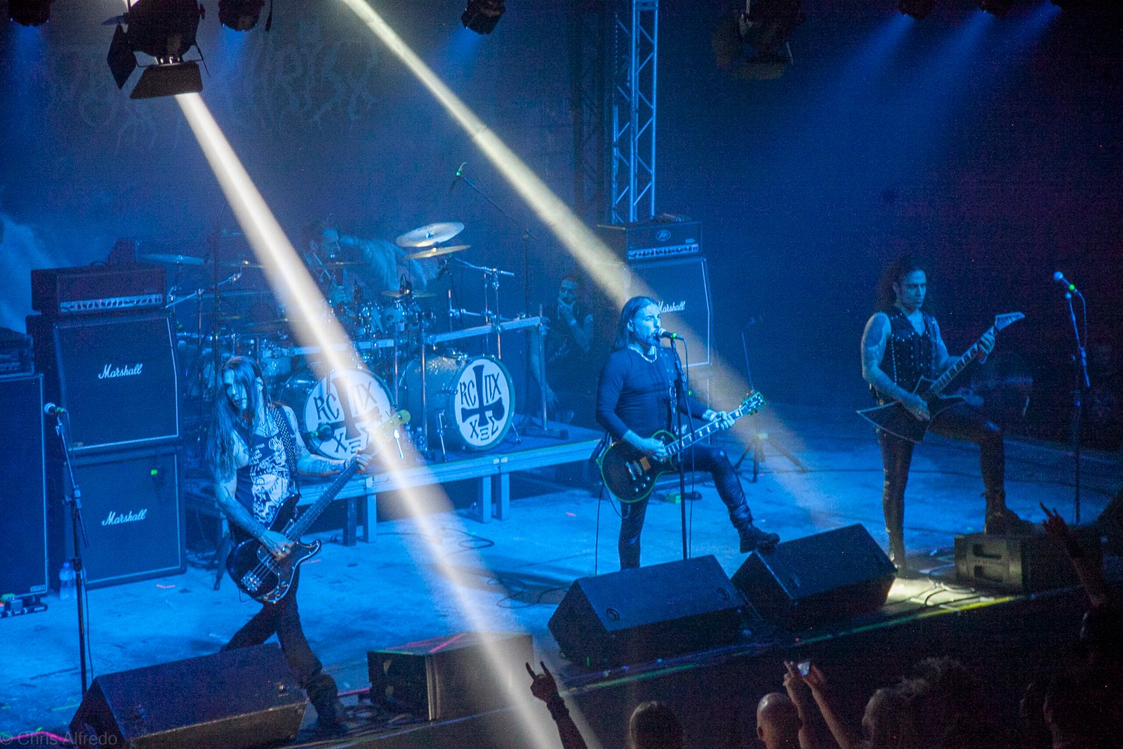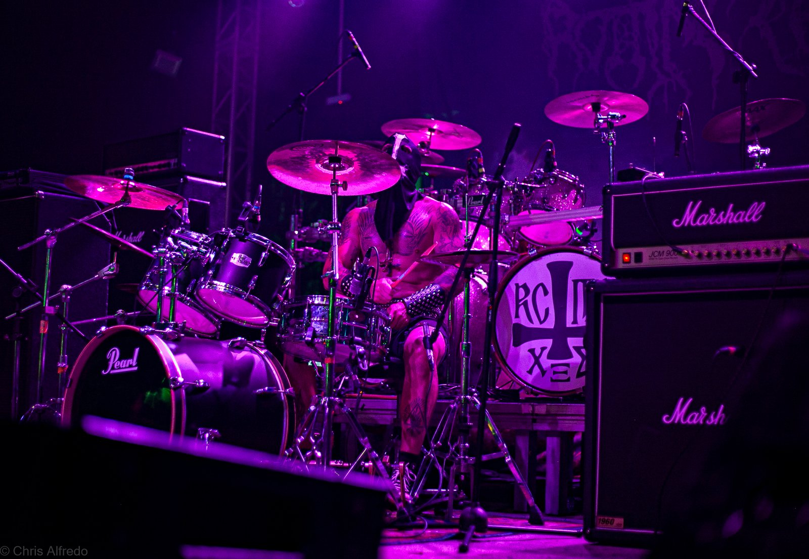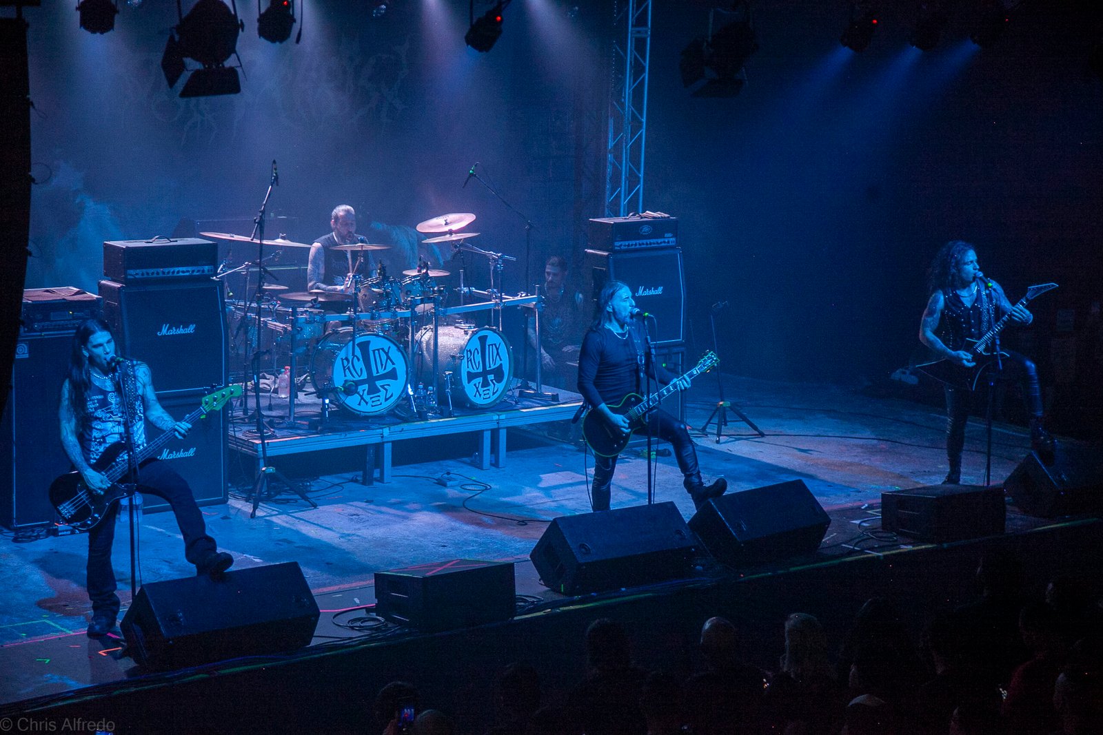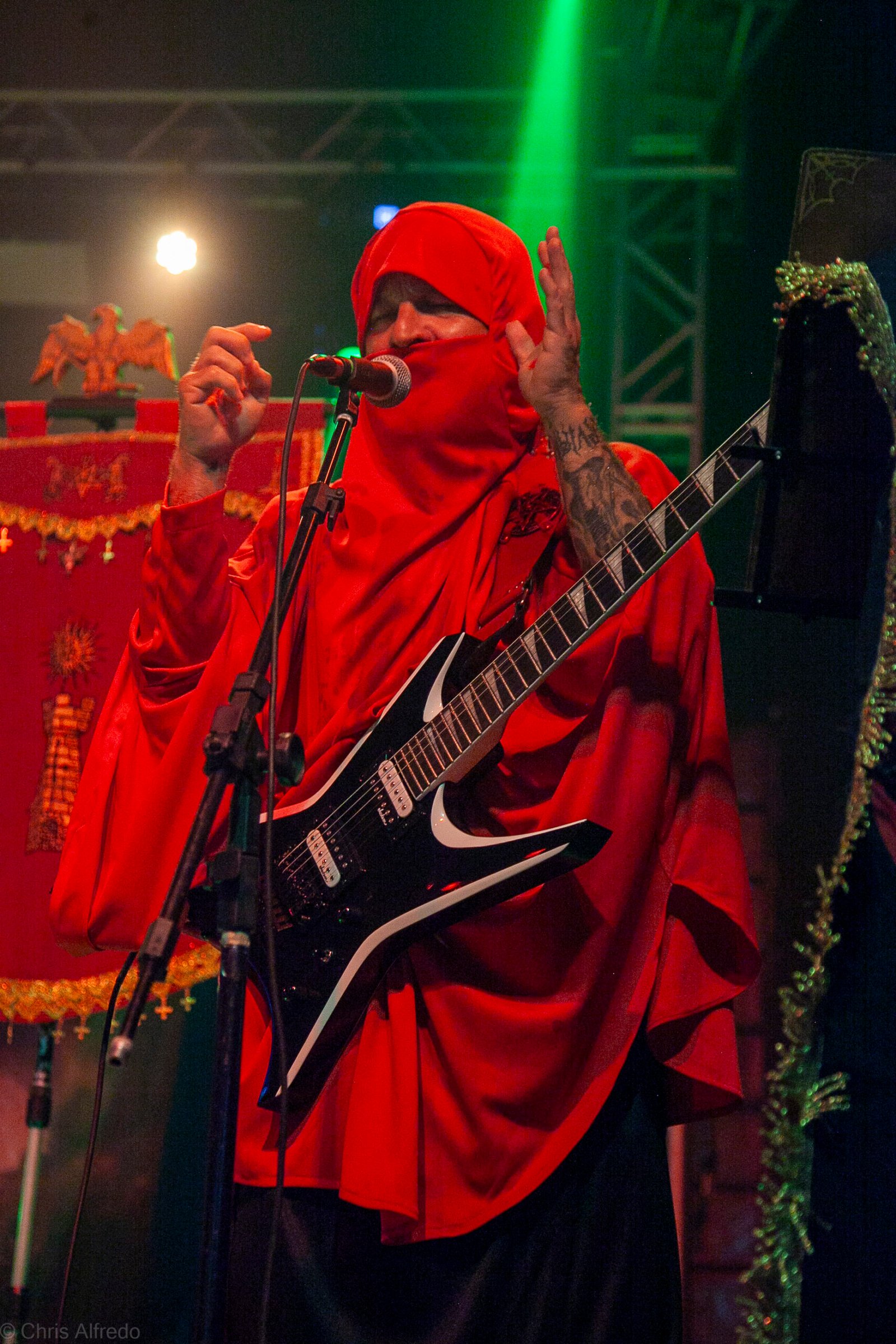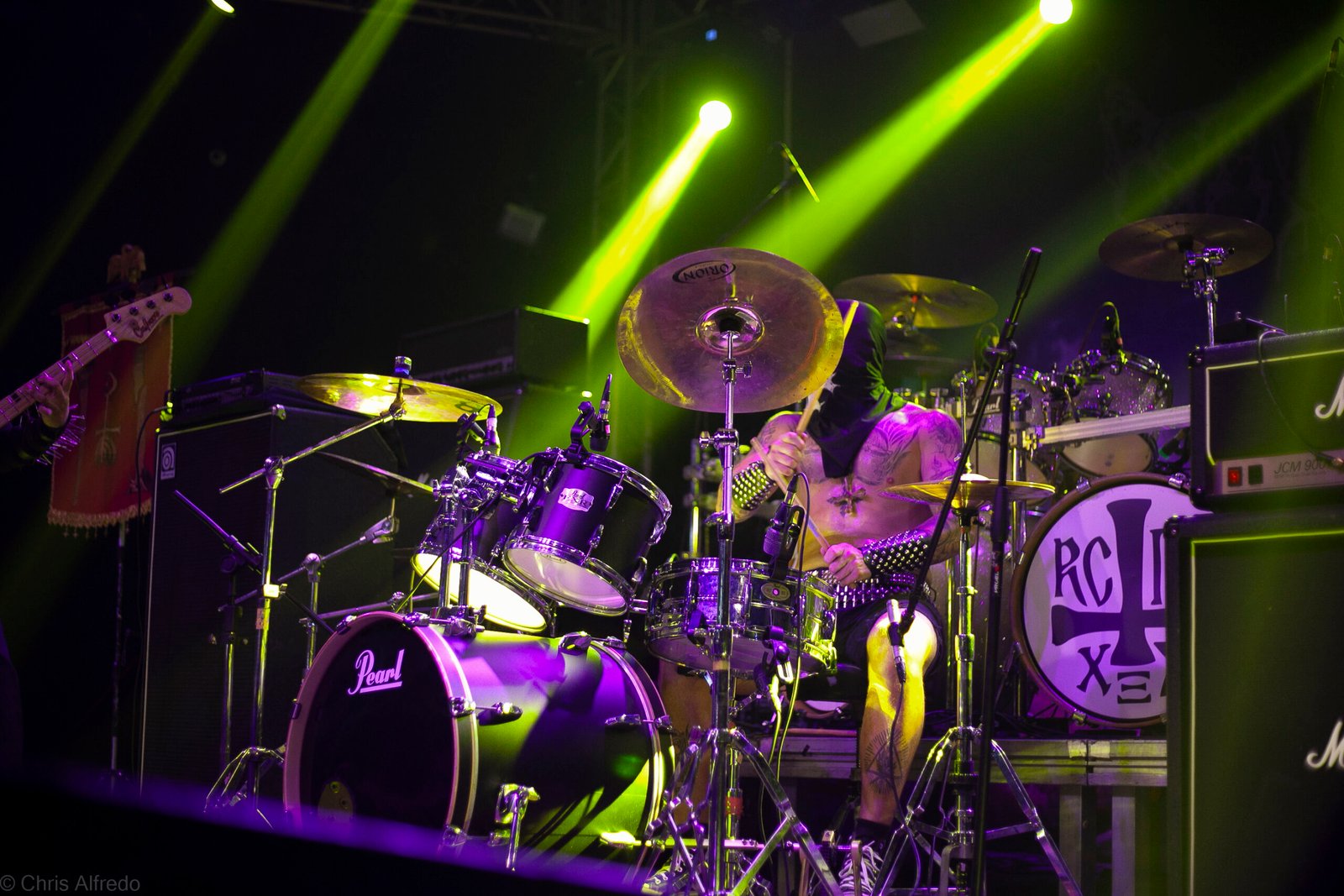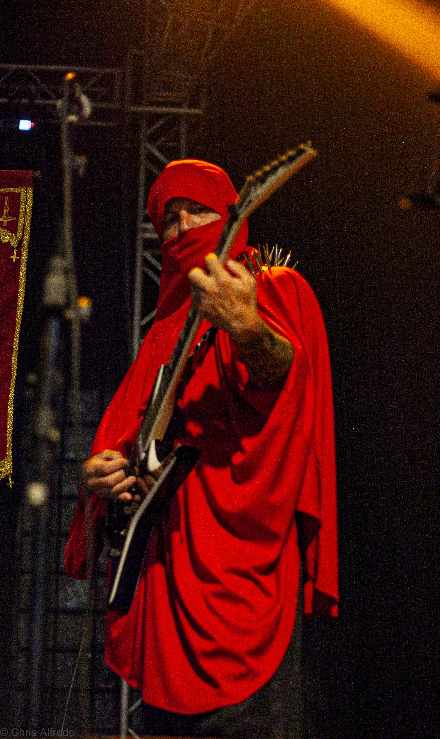 Com o horário da abertura dos portões marcado para as 19h, o público foi chegando aos poucos, adentrando o recinto com calma e sem filas ou tumultos, o que ocasionou também uma grande chance para quem é fã de ficar na grade, uma boa oportunidade para escolher o lugar que mais lhe agrada, uma vez que o destino da maioria que entrava era o grande balcão circular do bar que separa a pista e a espaçosa praça de alimentação da casa. Com a refrigeração em sua potência máxima e cerveja extremamente gelada, foi fácil esquecer o calor infernal que estava lá fora, pelo menos por uns minutos… No palco, viam-se púlpitos com livros que pareciam bíblias e bandeiras com símbolos associados a cultos pagãos, visão que anunciava que a noite seria exatamente isso, uma noite de grande blasfêmia.