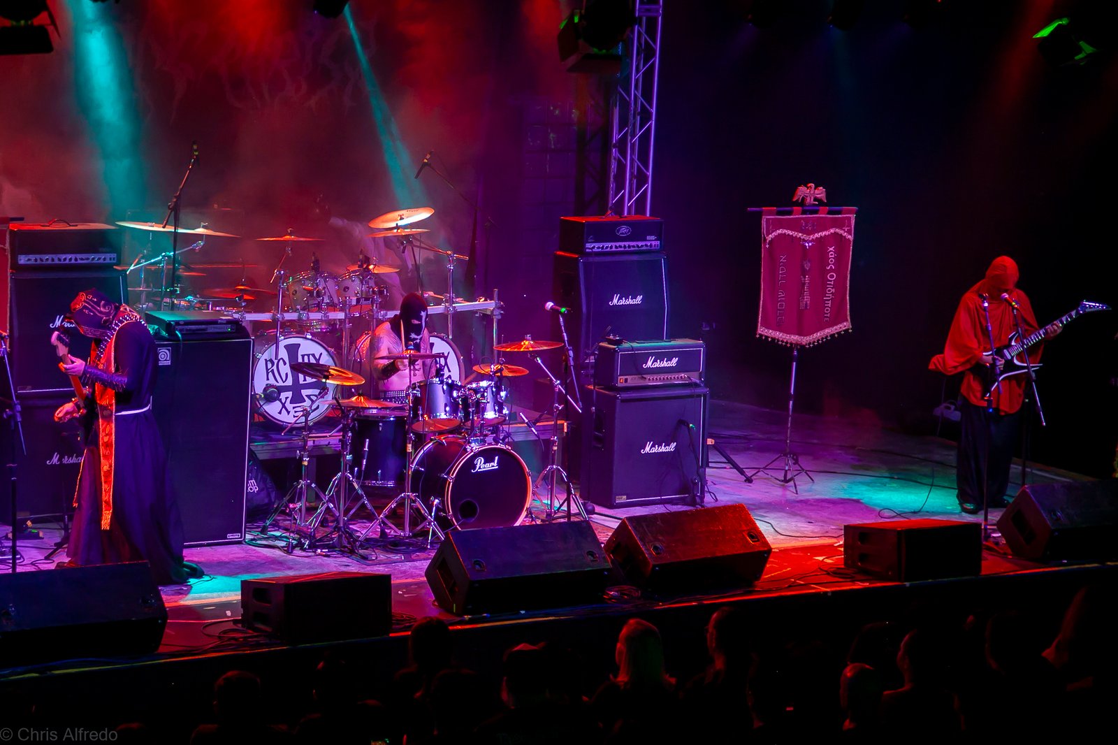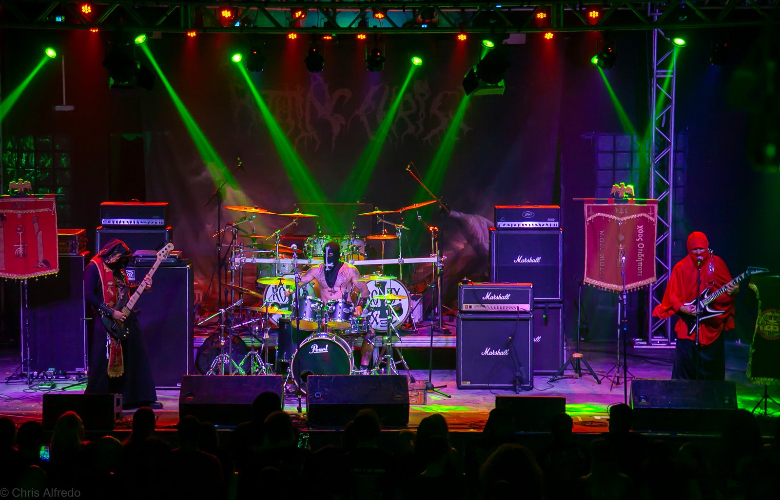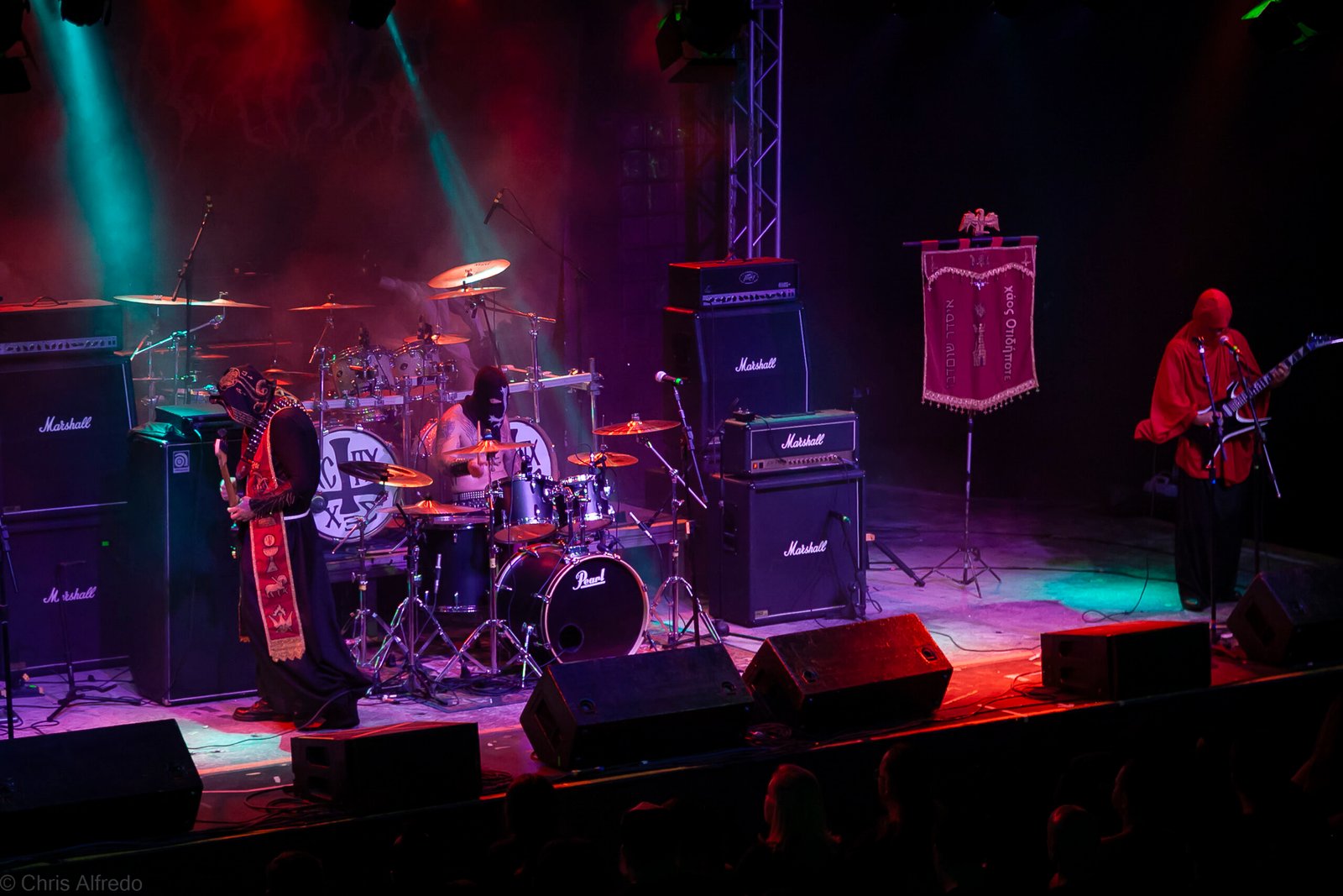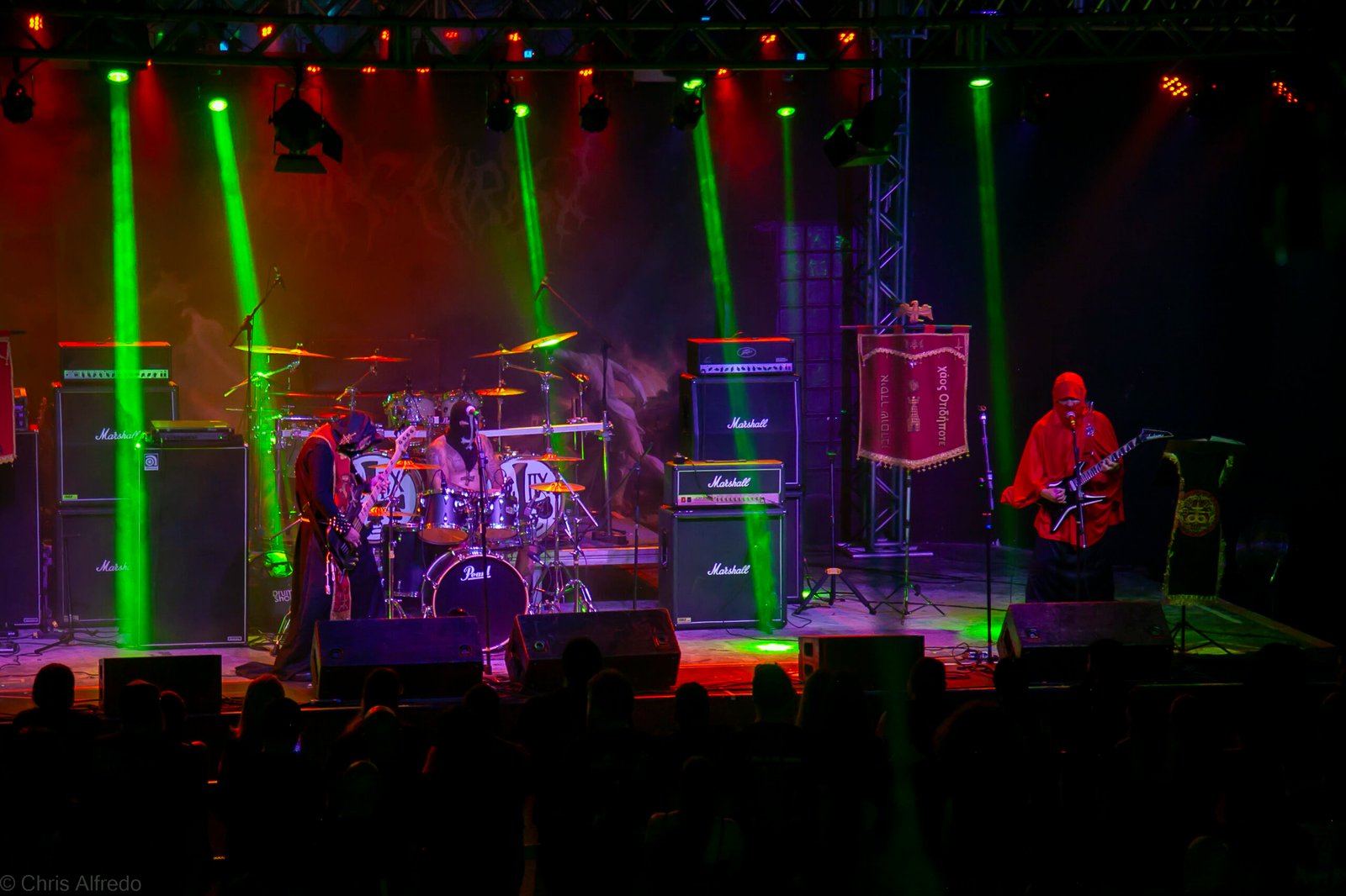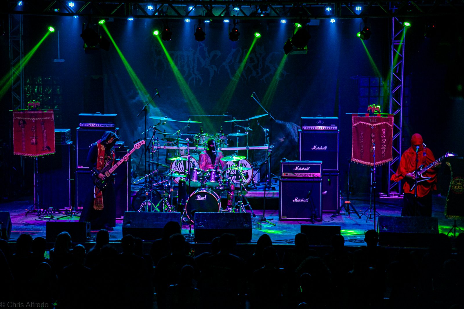 Pontualmente às 19h30, subiram ao palco três figuras peculiarmente caracterizadas, com vestes que lembram executores da Idade Média, ou ainda cultistas de missa obscura, seguindo a estética dos já citados adornos vistos no palco. Era a ótima banda Torchs of Nero, fundada no Rio Grande do Sul em 2021 e na ativa desde então com a mesma formação. Demonstraram logo nos primeiros acordes o porquê de terem sido escolhidos para abrir os trabalhos para a banda grega. Elogiada pelo próprio Sakis Tolis pelo EP intitulado MOKK de 2023, a banda que busca em sua essência honrar o Metal Extremo dos anos 80 e início dos 90, de mestres como Venom, Hellhammer e Celtic Frost, faz isso com louvor. Com um setlist curto, o trio executou algumas músicas que ainda não estão presentes na discografia da banda, destaque para a excelente Hosana Iscariot, tocada após a promessa de um álbum gravado ainda este ano.