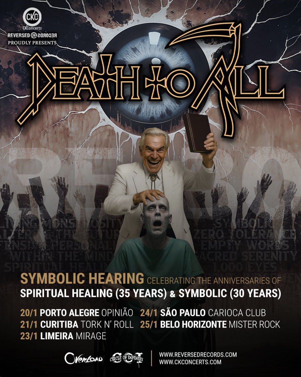 Death To All, projeto/turnê-tributo que reúne ex-integrantes do Death, confirma passagem pelo Brasil em janeiro de 2026 com foco nos álbuns Spiritual Healing (1990) e Symbolic (1995), que completam respectivamente 35 e 30 anos desde seus lançamentos. A turnê é uma produção da Overload em Porto Alegre, Curitiba, São Paulo e Belo Horizonte, e da Circle of Infinity em Limeira.