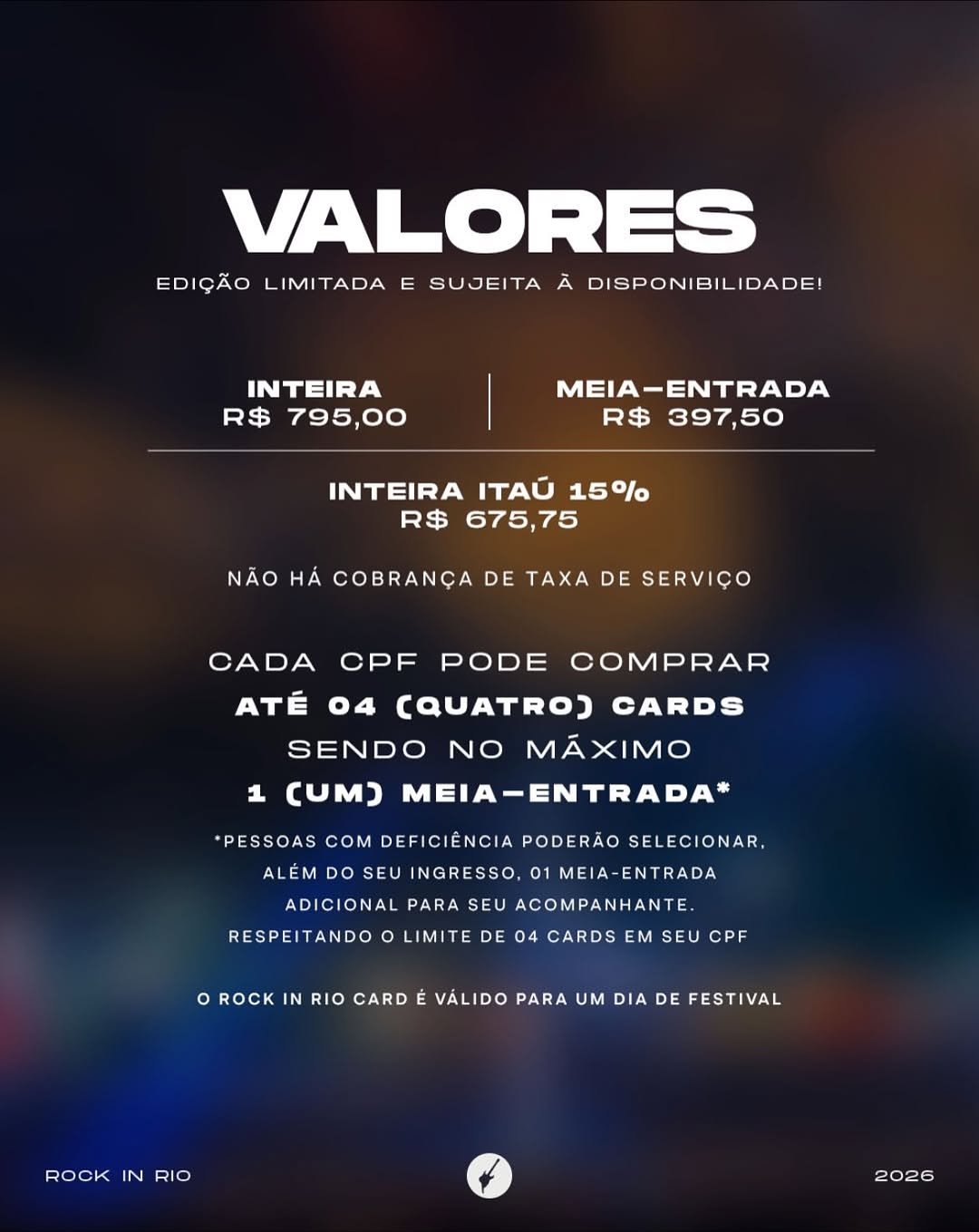 • Escolha do Rock in Rio Card: Quem já possui o Card (atualmente esgotado) tem até o dia 25 de maio de 2026, às 12h, para escolher a data de preferência no site.