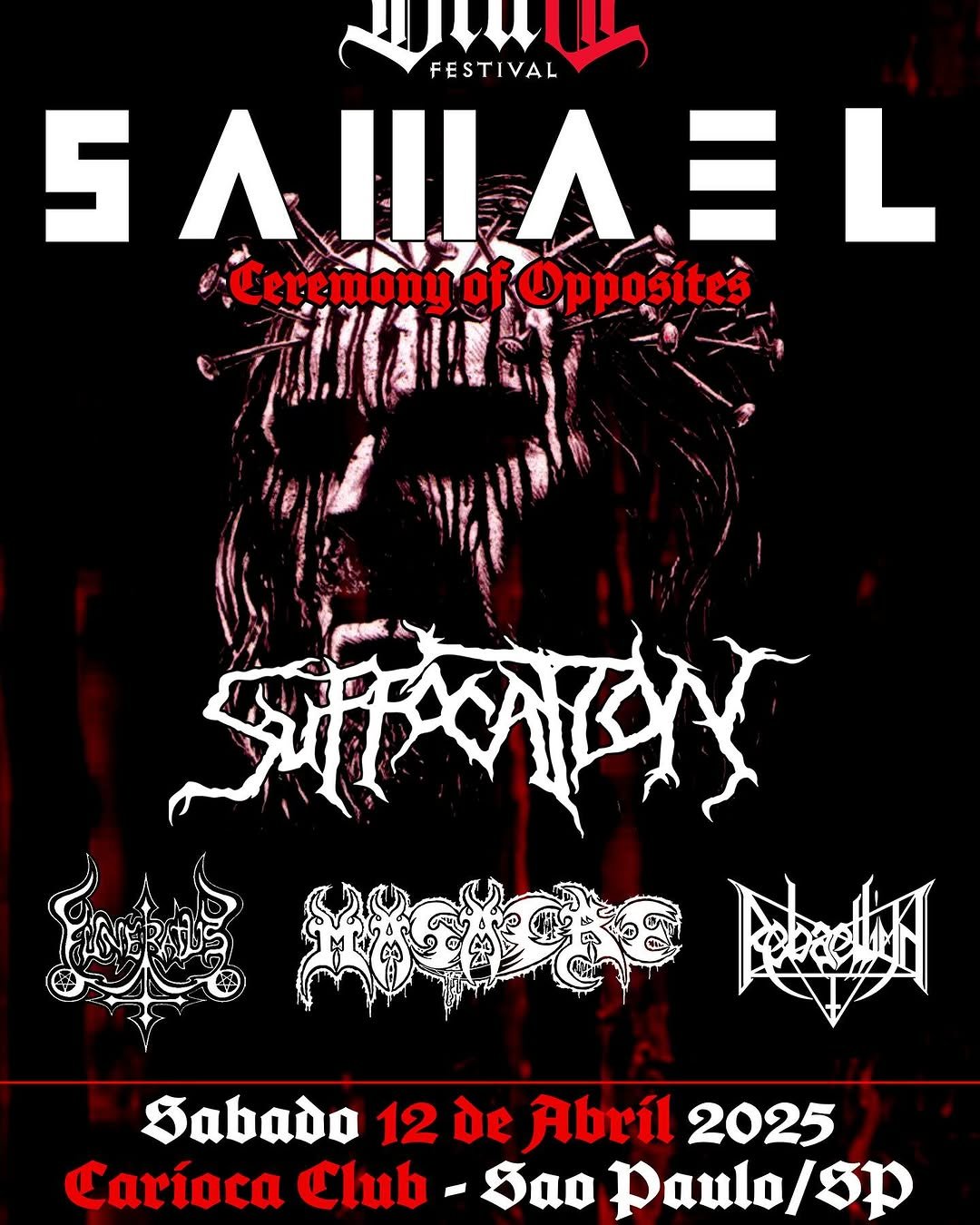 Bandas: Samael, Suffocation, Masacre, Funeratus e Rabaelliun
